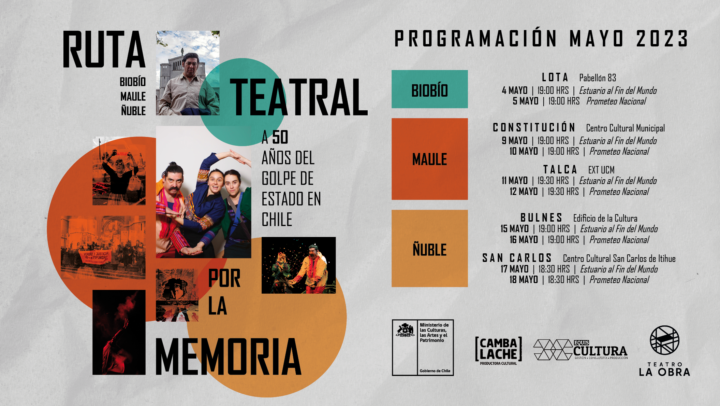 Movilizar las artes escénicas a distintos territorios, especialmente, no centralizados, ha sido un pulso creativo para Teatro La Obra, en sus más de 20 años de trayectoria. En ese deseo, los proyectos de circulación e itinerancia de sus montajes les han llevado a distintas ciudades, de norte a sur y, también, les han permitido presentar sus obras en espacios no convencionales y alejados de la infraestructura escénica. A 50 años del golpe militar en Chile y vinculando su trabajo teatral a toda la programación cultural 2023 que se está gestando a nivel nacional, Teatro La Obra iniciará una circulación por la región del Maule, Ñuble y Biobío con dos de sus piezas más emblemáticas: «Prometeo Nacional» (+13) y «Estuario al fin del Mundo» (+7). La «Ruta Teatral por la Memoria», será gratuita del 4 al 18 de mayo e integra, también, funciones mediadas para comunidades escolares de las tres regiones.