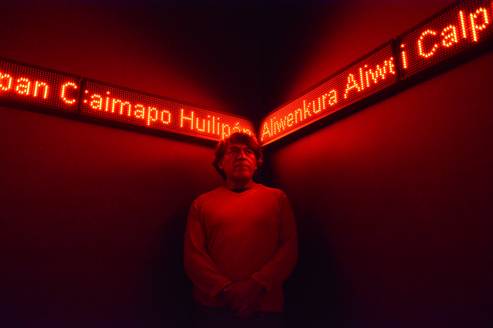 Werken consists of the installation of 1000 Mapuche masks Collón that, located in the center of the room, form a figure with irregular contours that occupies approximately 10 x 11 meters. These are supported by rods of natural iron, while the perimeter walls of the room are surrounded by led signs that will leave the script of 6906 Mapuche surnames, corresponding to the totality of the surnames that currently exist.