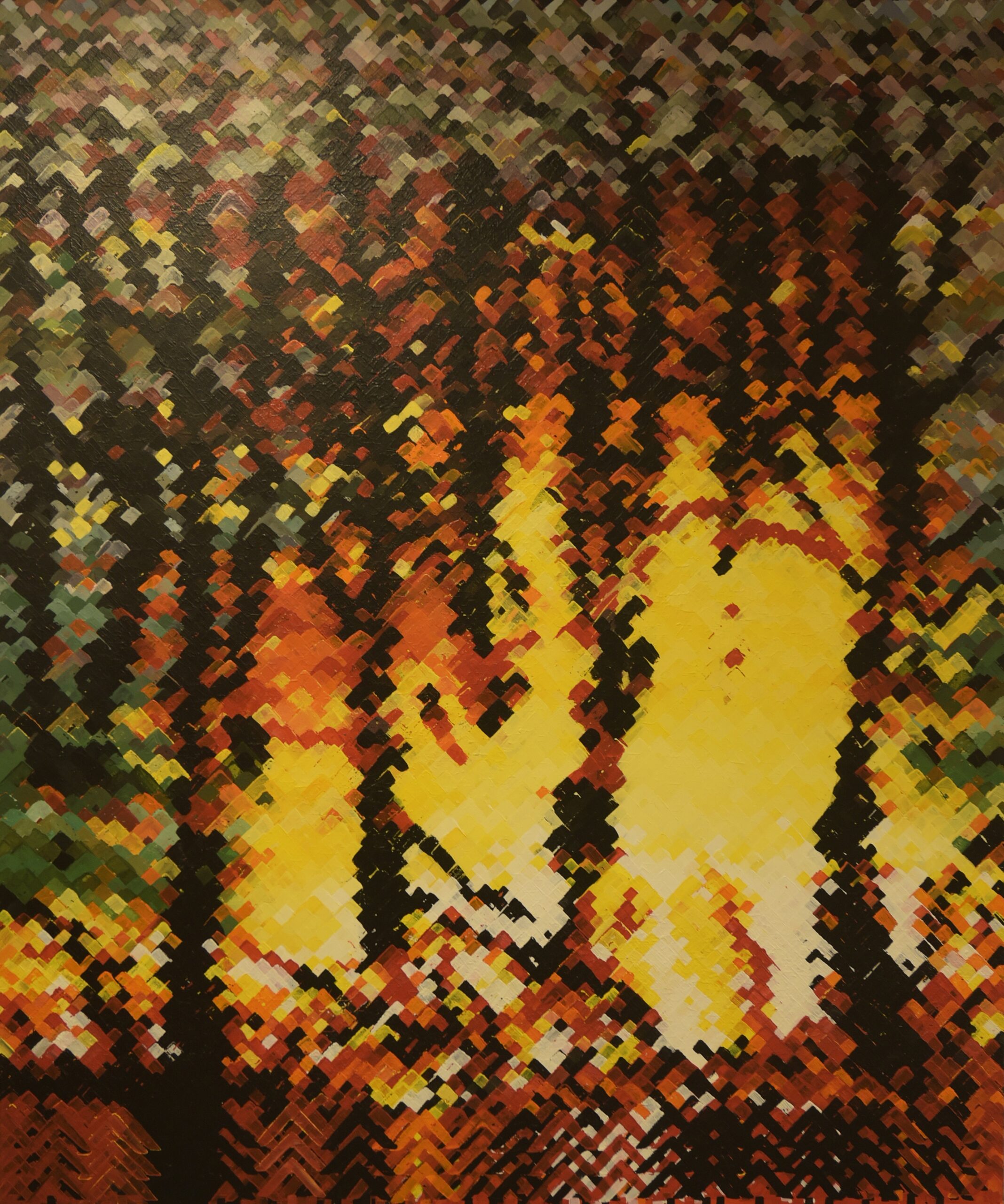 Patrón 5 forma parte de una serie de pinturas en gran formato que reflexionan sobre las zonas de sacrificio medioambiental y su impacto en el territorio. Se compone de la reiteración del logo de una empresa forestal, el cual es utilizado a modo de «pixel» con el fin de representar el problema de los incendios forestales.