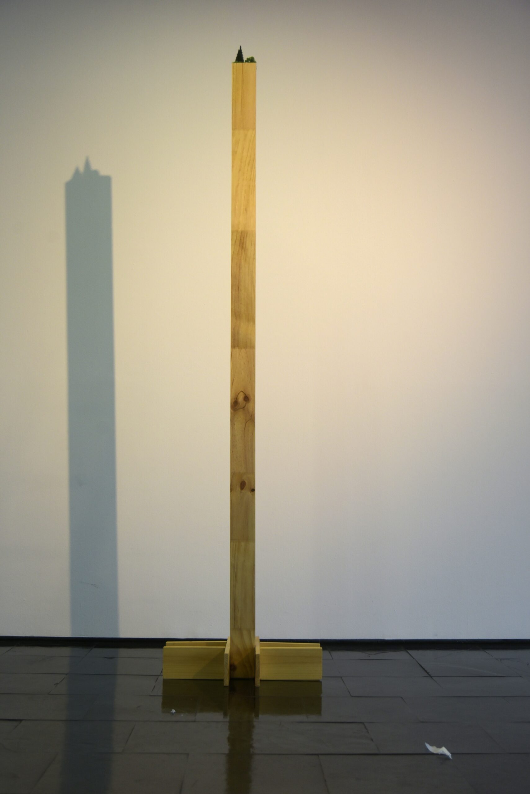 El concepto sobre el que gira este trabajo es la distancia física, visual y táctil de la representación de un pequeño paisaje ubicado en la parte más alta de la viga, un límite que restringe su aproximación. Establece una relación frágil que propone a quien la ve, reconocerse en la imposibilidad de acceder al territorio.
