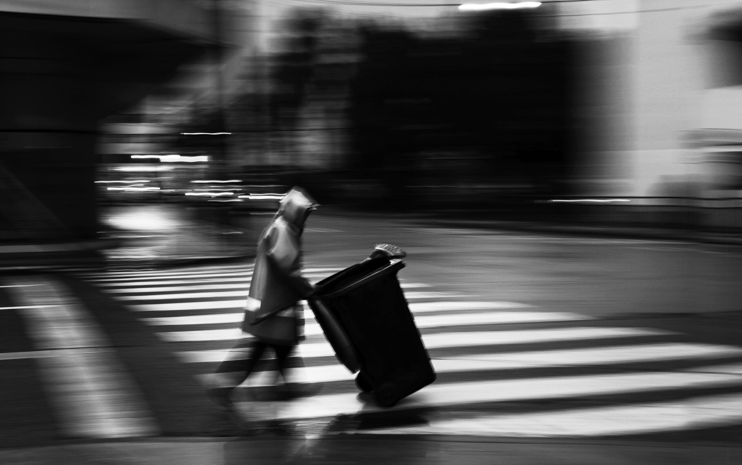 Every day captura a un trabajador de aseo y ornato en Chacabuco con Independencia en Valdivia. Junto con So raise your fists and march around, son parte de la serie “The sound of silence”, de fotografías urbanas en blanco y negro que Eduardo Asenjo comenzó a desarrollar en 2015. Esta serie representa la forma en que el artista escucha la ciudad: para escuchar a alguien hablar debe concentrarse solo en su voz y “borrar” la contaminación acústica que la rodea. Con el fin de reflejar el ruido en la imagen, utiliza larga exposición diurna y el movimiento intencional de la cámara, que generan movimiento y desenfocan la imagen.