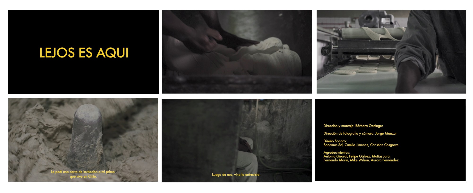 En Lejos es aquí un hombre haitiano relata su experiencia migratoria a Chile, mientras trabaja elaborando marraquetas en una panadería. Su testimonio, silencioso, describe las complejas situaciones que ha debido enfrentar desde su partida de la ciudad Fuerte Libertad en Haití, hasta su llegada a Santiago de Chile.
