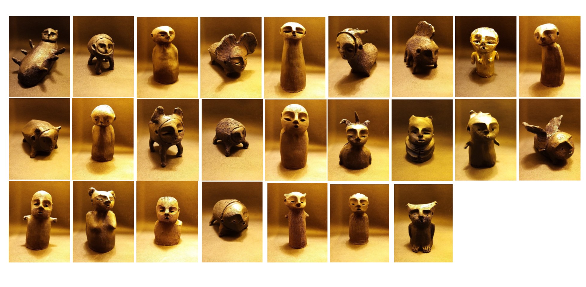 Braulio Díaz realiza pequeñas figuras de arcilla y greda antropomorfas, que vincula a la crisis ecológica actual desde su producción. Por esto, se enfrenta a procesos artesanales primarios, a manuales que enseñan a manipular la tierra, el fuego para las cochuras, el agua y el aire. Esto le permite repensar el presente.