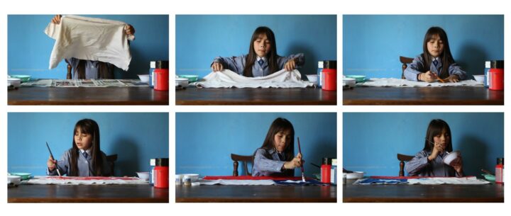 Consiste en un video que muestra a una niña escolar pintando una bandera chilena que luego es instalada en los pilares del edificio institucional. Este trabajo ofrece una imagen cuyo objetivo es invitar a los espectadores a pensar el juego y la doctrina, el uniforme y la creación artística, las instituciones y las tensiones históricas frente a la construcción de la chilenidad.