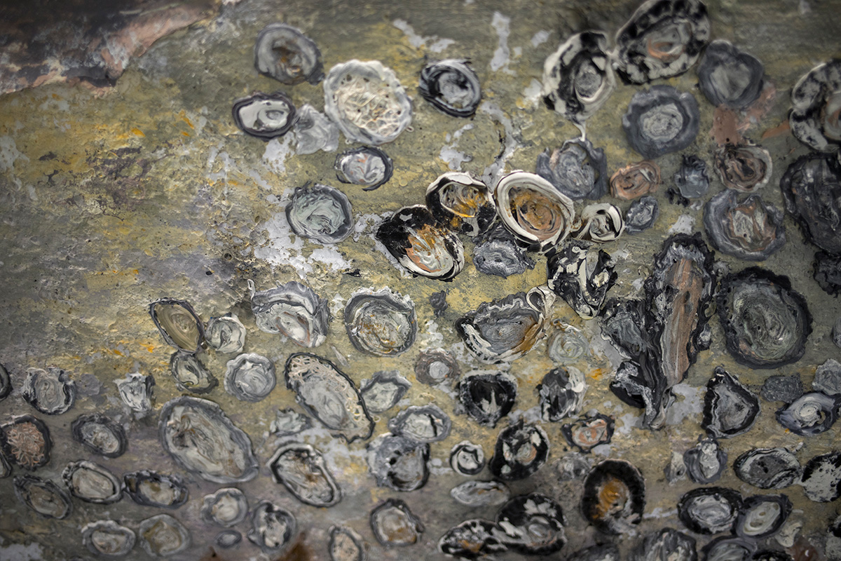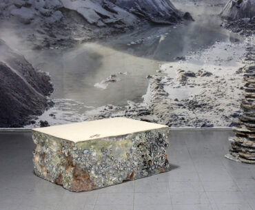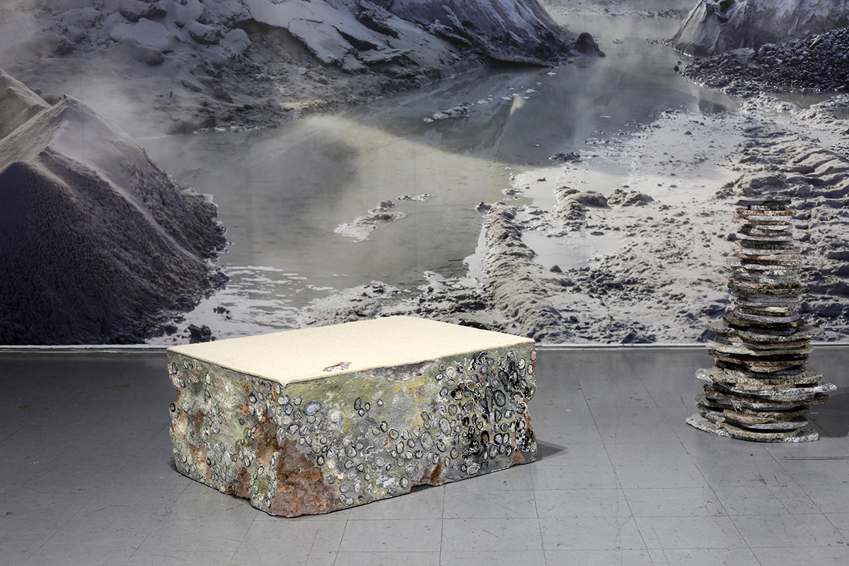 Con la intención de amplificar las capas industriales y minerales atrapadas en este material y revincularlo a su origen geológico, la artista realizó esta escultura, sobre la cual la audiencia puede sentarse —como si se tratara de una roca o un sillón— y percibir desde allí el resto del espacio, reconociendo sus implicancias tanto naturales como culturales.