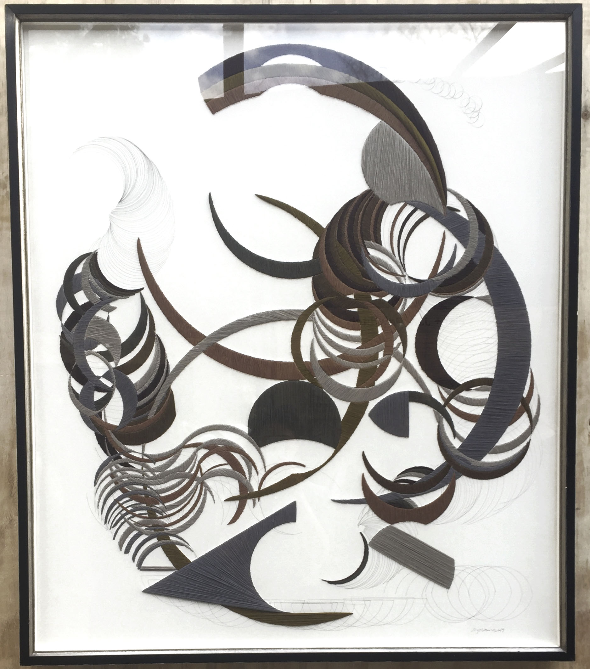 La composición alude a un imaginario astral lunar, a los movimientos de la Tierra y el Sol. El caos de líneas grafito parecieran apropiarse del espacio, pero a medida que el ojo se sumerge en la oba, los trazos adquieren un orden y estructura propia. Los hilos crean discos y elipses con simetrías y equilibrios, formando una partitura visual. Así, el ojo continúa un recorrido que salta de una estructura a otra, de forma libre y aleatoria.