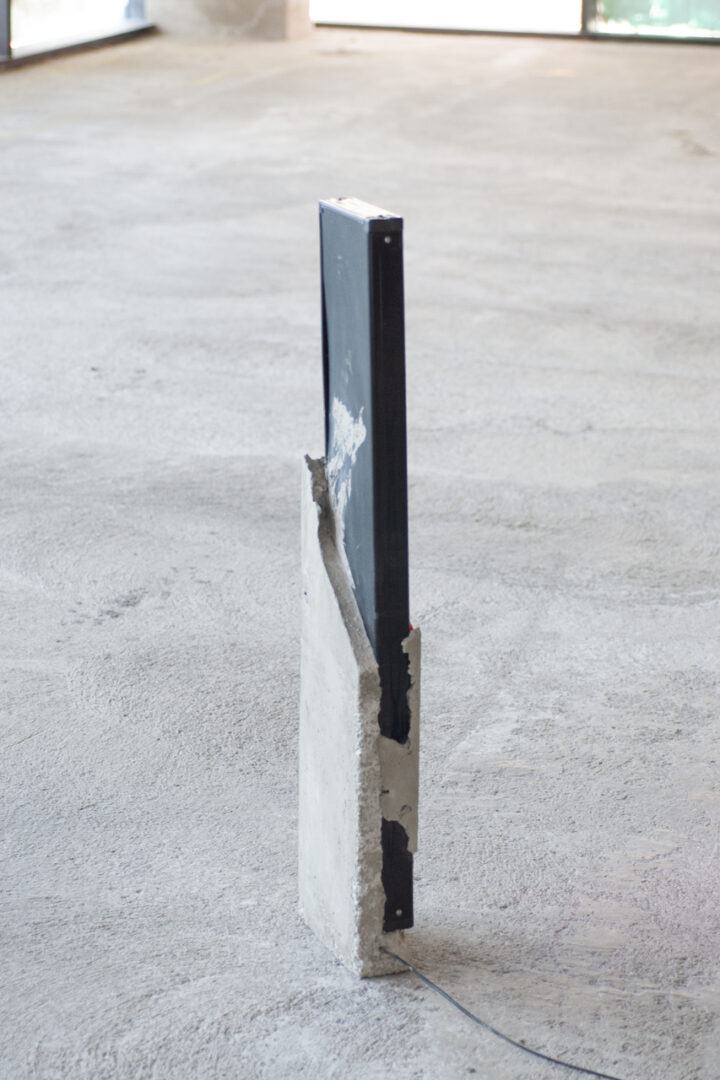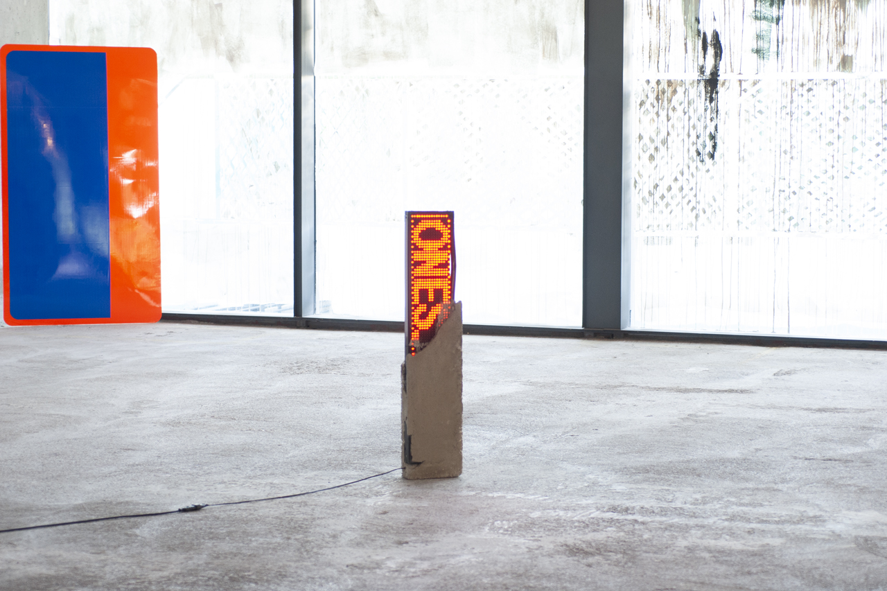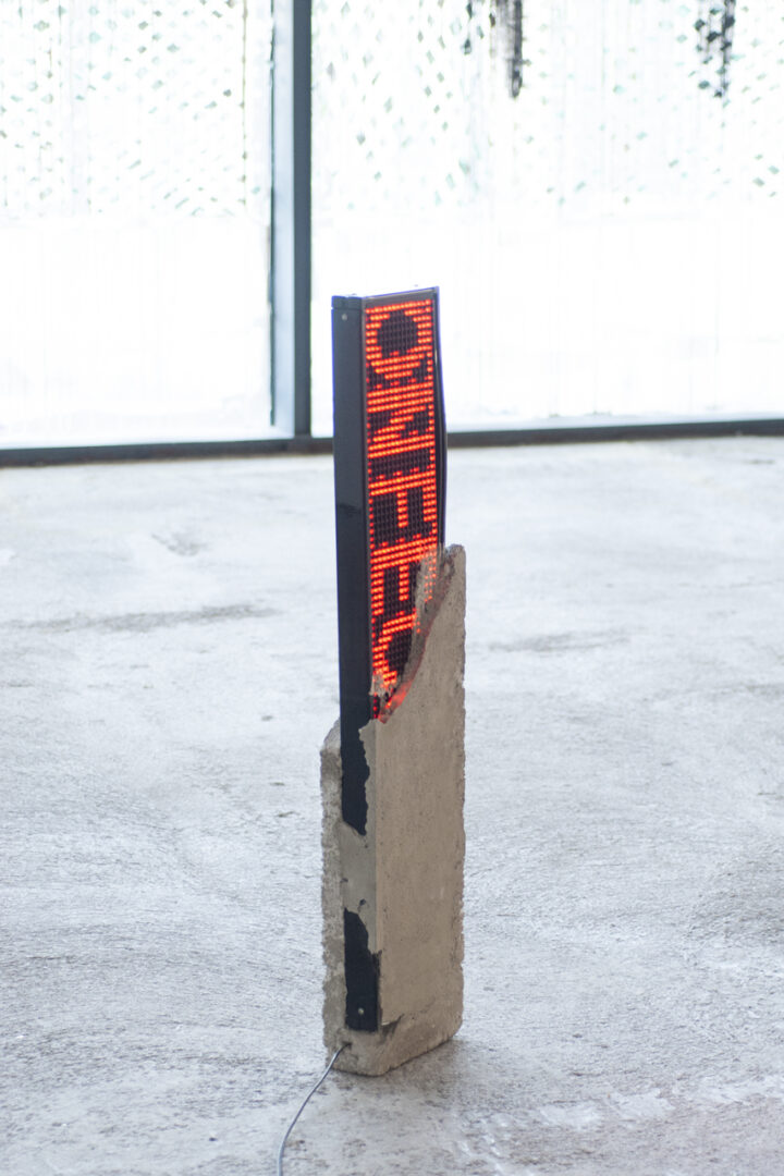 Durante el 2016 Nicholas Jackson recolectó objetos publicitarios en desuso que encontró en sus trayectos diarios. Los intervino con el fin de desarticular su función, que es comunicar. La necesidad de obstruir la comunicación utilitaria, en este caso, operó desde la autobiografía, desde el recuerdo de sus sesiones y los ejercicios de articulación con fonoaudiólogo para mejorar su tartamudeo infantil. En Concretar una venta, al introducir el objeto en concreto fresco buscó detener o bloquear el mensaje originalmente programado en este típico cartel led.