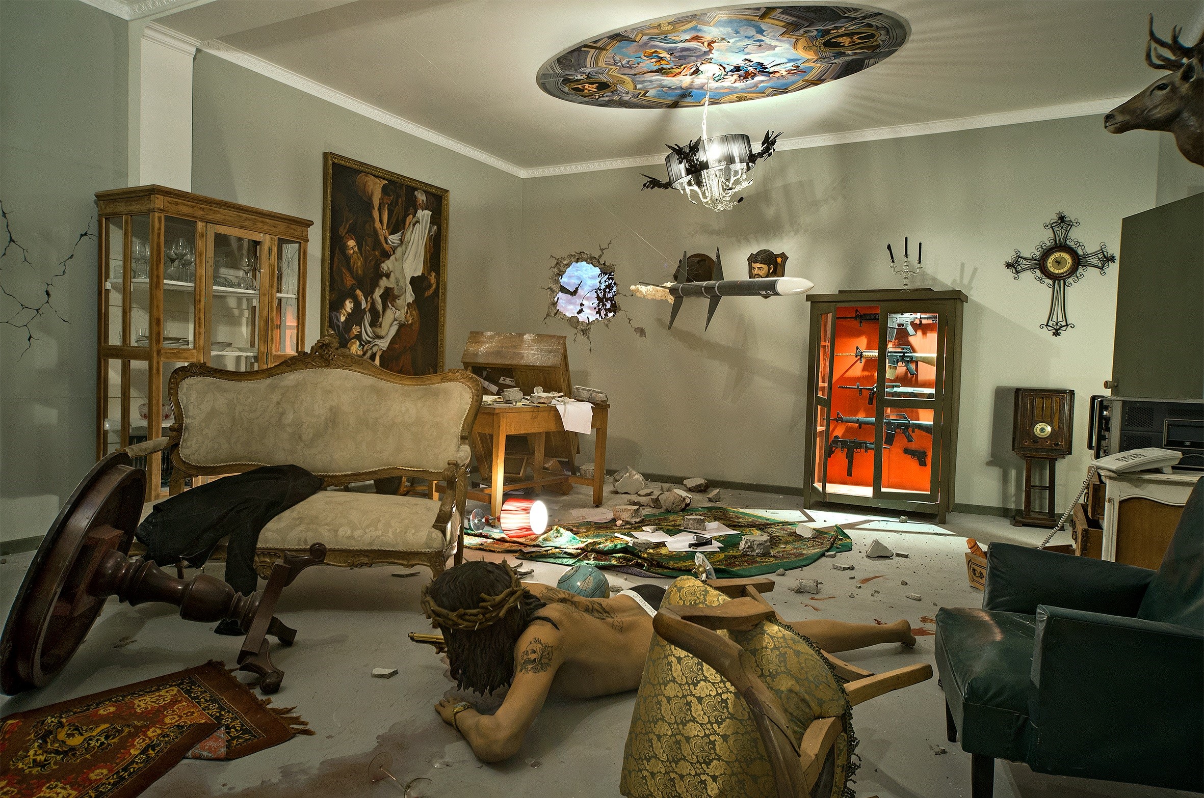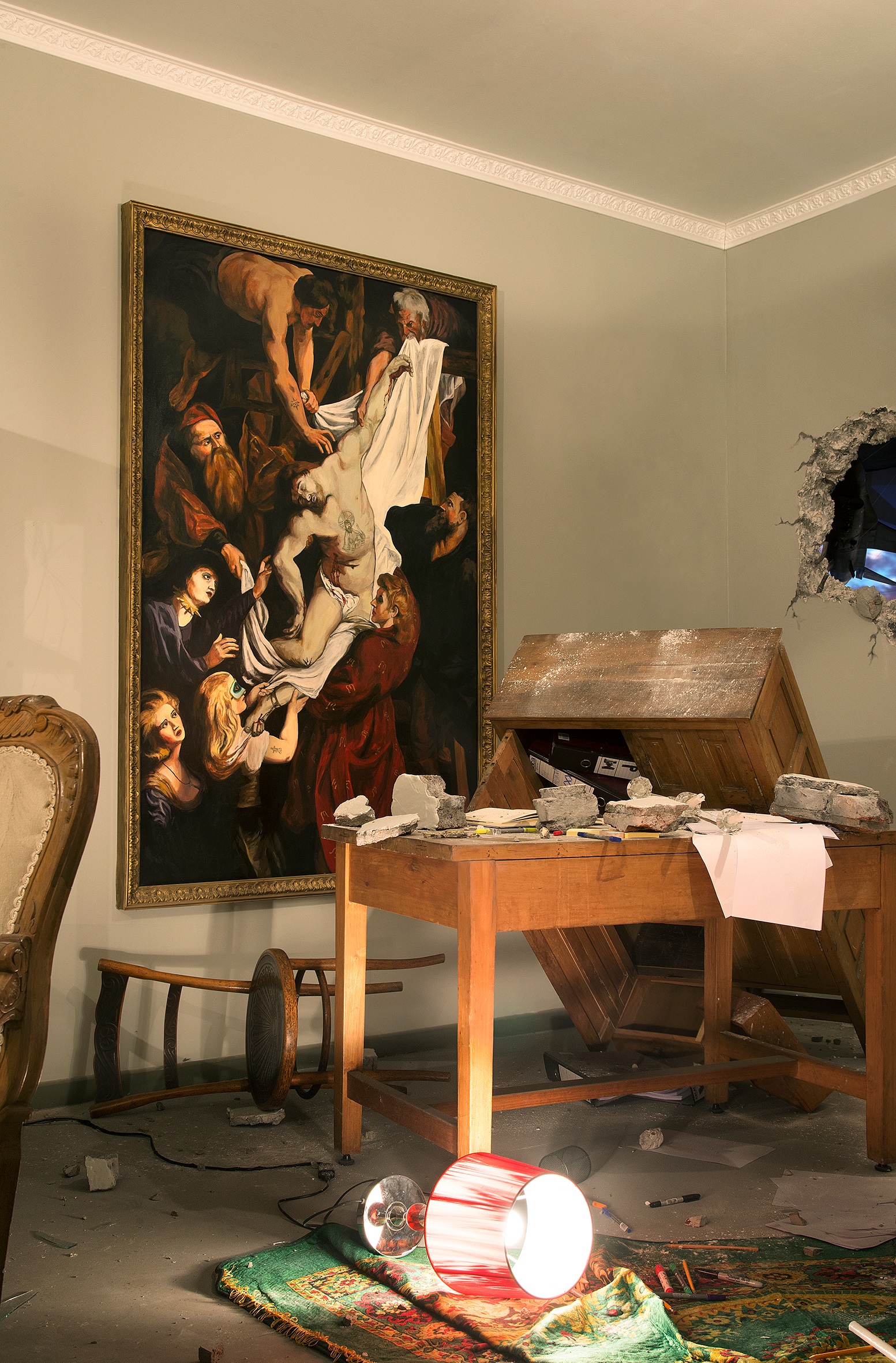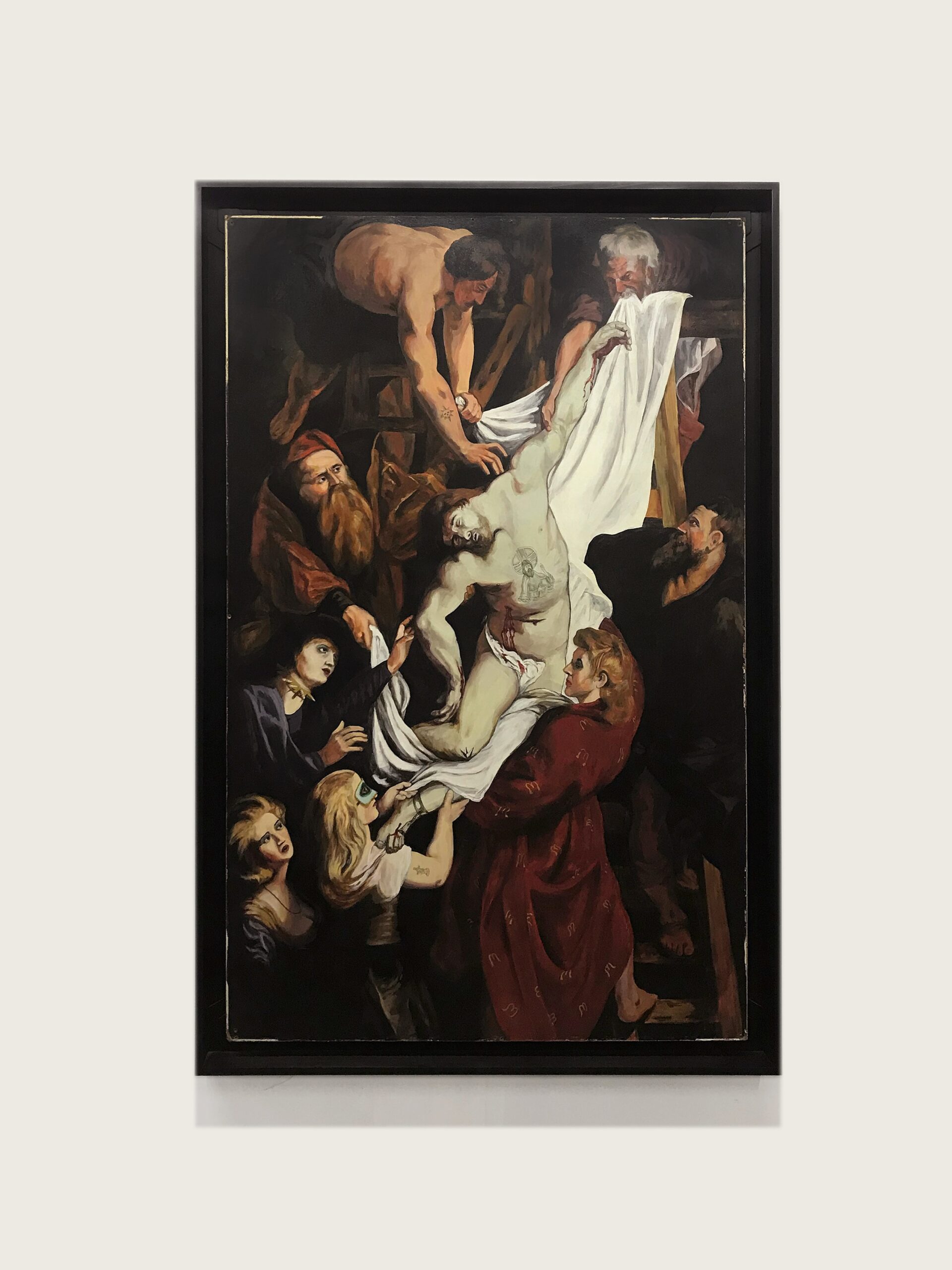 El descenso es una pintura que formó parte de la instalación Del paisaje y sus reinos, realizada en el MAC Quinta Normal en 2013. La instalación simula un instante detenido en el tiempo, en una habitación inspirada en el neoclásico: en ella vemos frescos, imágenes celestiales, personajes religiosos, iconografía cristiana. Pero también la imagen escenifica un instante caótico: un Cristo que se arrastra por el suelo, objetos rotos, paredes perforadas. Es un cuadro que replica la pintura homónima de Rubens, que representa el momento en que Cristo desciende de la cruz. A diferencia del resto de los elementos que se encuentran en la habitación, permanece intacto.