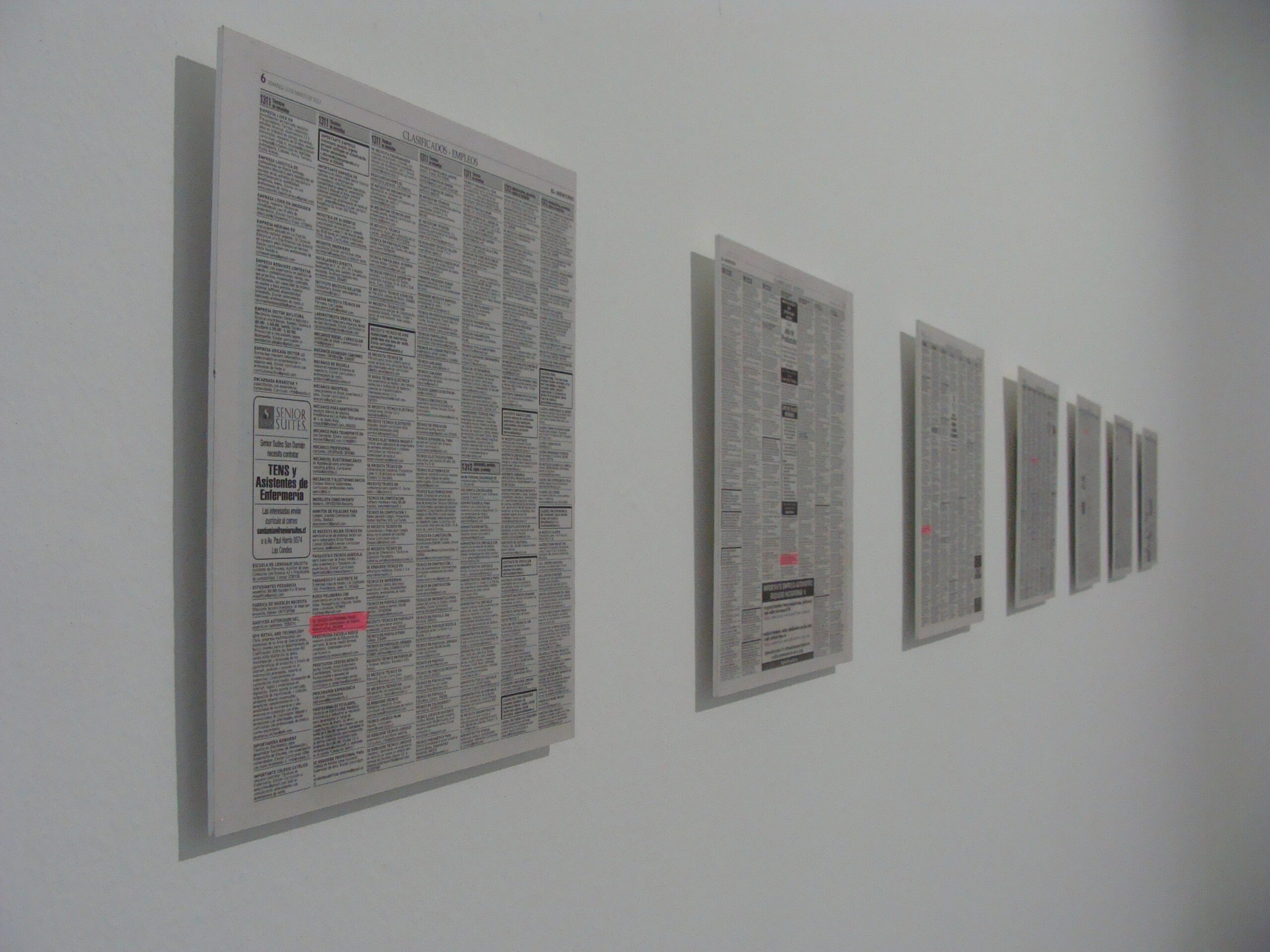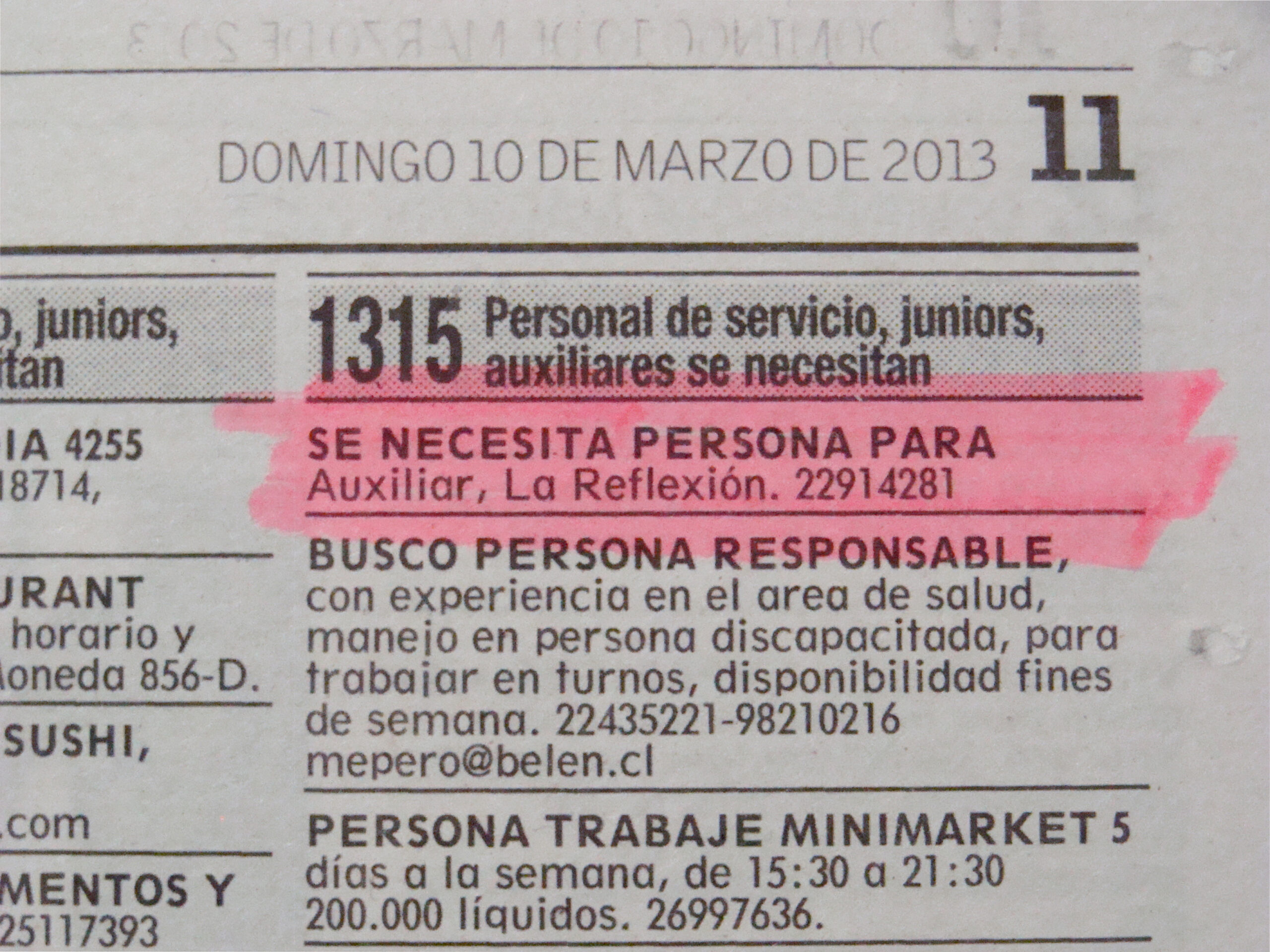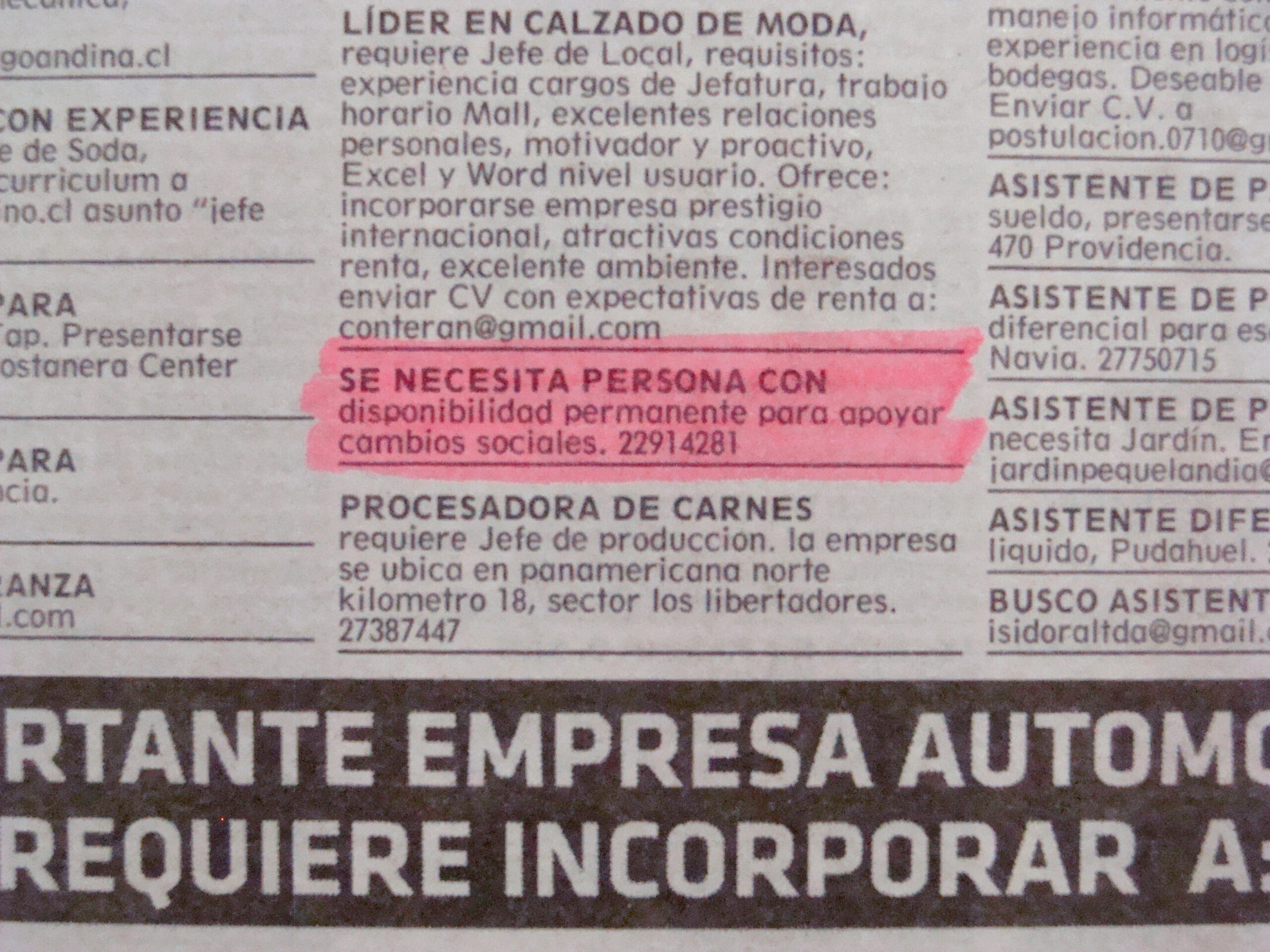 El domingo 10 de marzo del 2012 la artista publicó siete avisos en la sección “Empleos” del suplemento económico de El Mercurio con los siguientes enunciados: “Se necesita trabajador(a) capacitado(a) en construcción de estructuras para el bien común”, “Se necesita profesional capacitado en materias sobre abusos al trabajador”, “Se necesita persona para auxiliar la reflexión”, “Se necesita persona crítica, organizada y capaz de organizarse”, “Se necesita persona para analizar los sostenedores del modelo laboral actual”, “Se necesita trabajador(a) que promueva prácticas laborales dignas”, y “Se necesita persona con disponibilidad permanente para apoyar cambios sociales”, todos acompañados de un número de contacto.