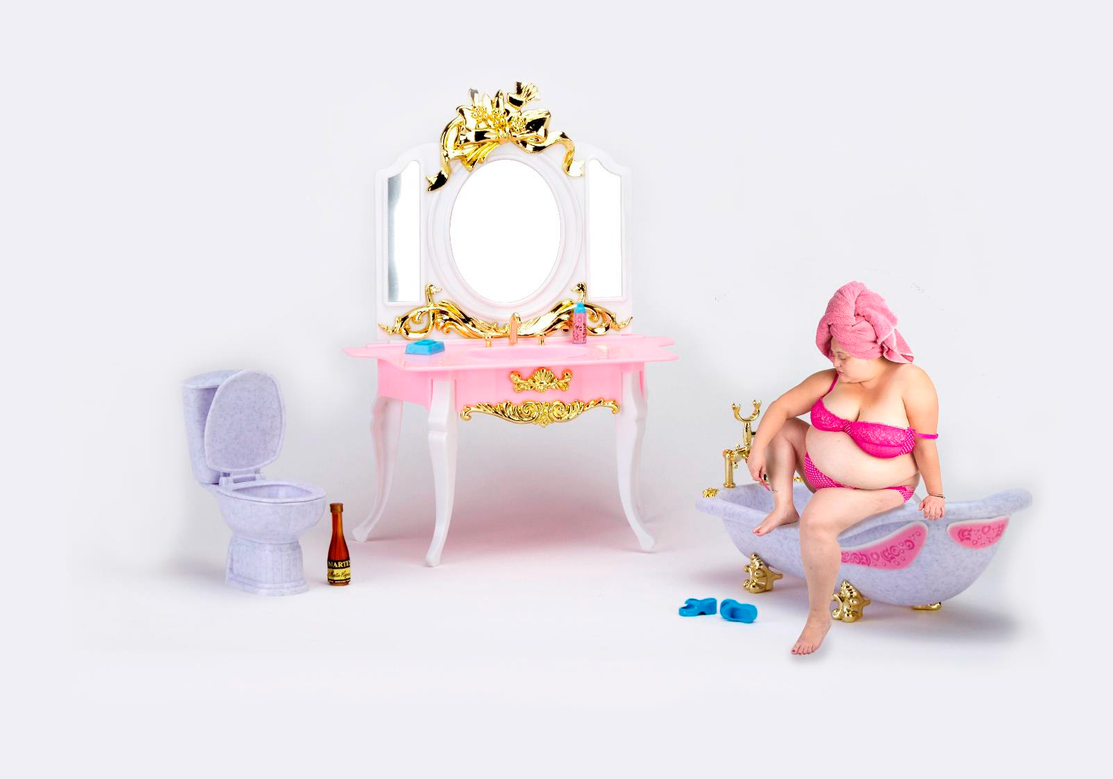 Mediante la obra Mujer acicalándose, Rocío Hormazábal propone algunas preguntas: ¿qué soñábamos cuando jugábamos a las barbies? ¿Cómo un juguete invita a las mujeres a proyectarse como ejemplos de independencia y perfección frente a la sociedad? Esta fotografía nace con el fin de reflexionar sobre los cuerpos disidentes, la gordofobia y la cosificación de la mujer en relación a su idealización social, cultural y machista. Al trabajar con la dinámica del autorretrato, la artista se presenta como una mujer que realiza un acto natural y en la intimidad: acicalarse para ella misma y no para los demás.