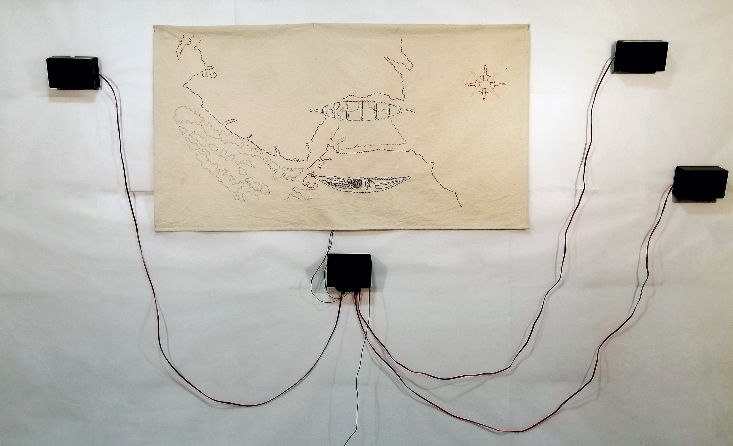 Para elaborar esta obra, Sandra Ulloa utilizó la imagen de una cartografía del siglo XVI sobre la cual bordó una canoa kawésqar con hilo conductivo que al tocarlo activa tres relatos de Carolina Quintul, mujer kawésqar que en su adultez se enteró de su vínculo con esta etnia de canoeros que hace miles de años navegaron las aguas que unen dos océanos.