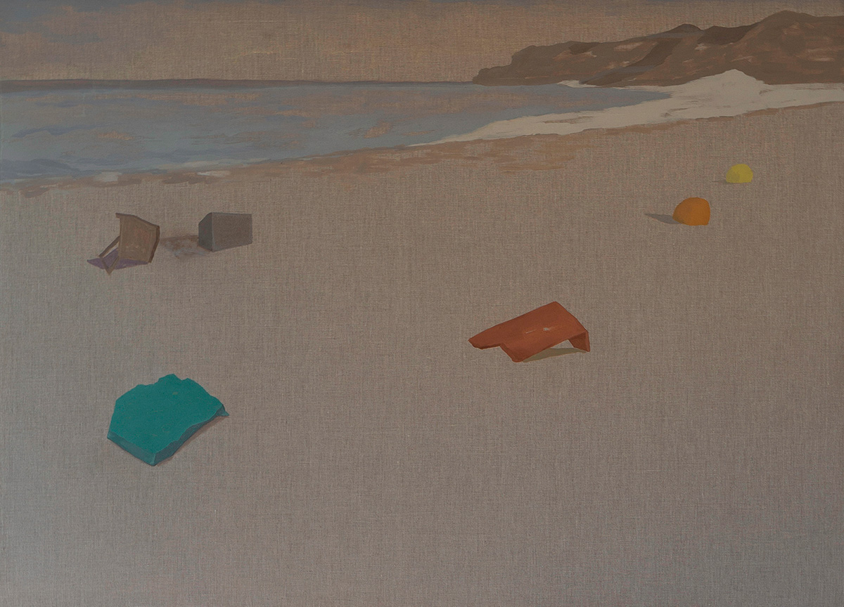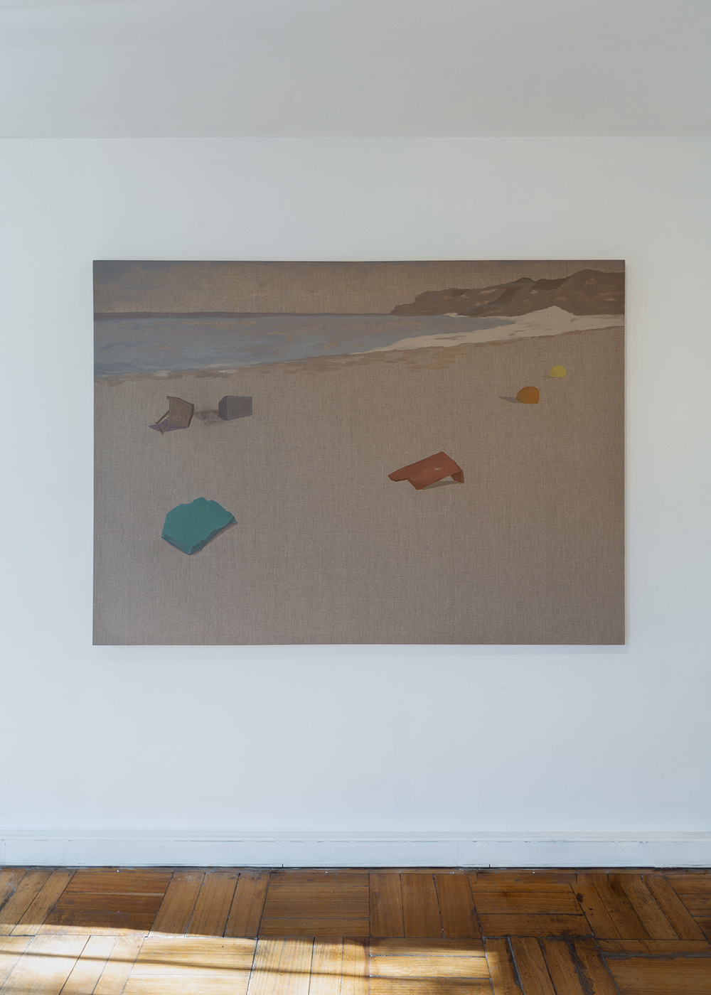 Mar, cielo, rocas y plantas toma como punto de partida fotografías de paisajes costeros contaminados, en las que se aprecian composiciones visualmente interesantes a partir de objetos desechados en la playa. Sofía del Pedregal realizó una investigación pictórica de abstracción de dichos paisajes a través de la mancha y la síntesis de las formas.