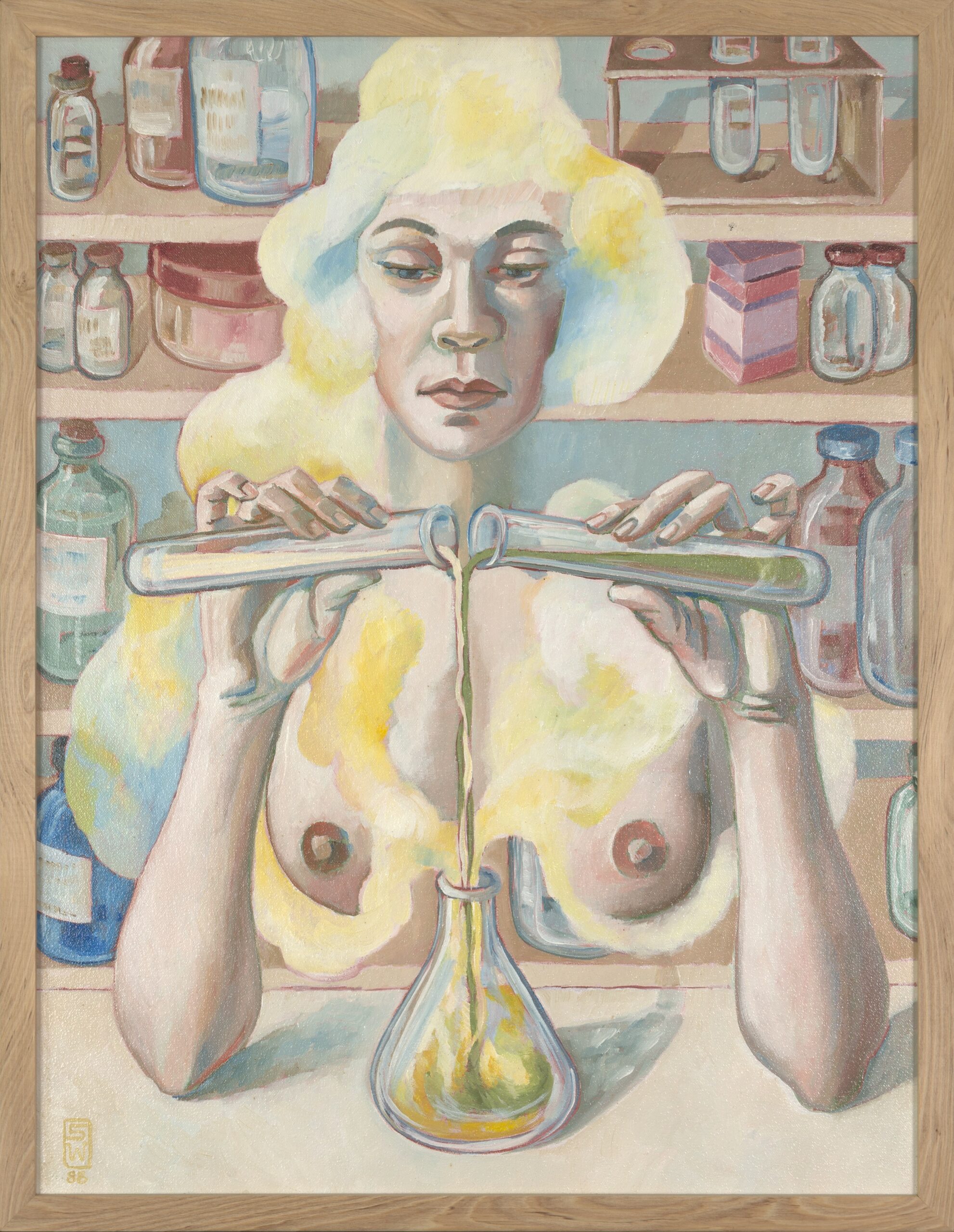 Esta pintura es la penúltima de una serie de veintitrés cuadros dedicados al tema de las “Mujeres de” (1982-1988). La serie surgió a partir de un boceto que la artista envió en tono de “broma” a Edouard Jaguer (1924-2006), fundador del movimiento postsurrealista Phases en el cual la artista participó activamente durante los setenta. El boceto –pintado sobre una servilleta– presentaba un velador compuesto por dos brazos de mujer que abrían sus cajones. Susana se inspiró del Ultra furniture del surrealista Kurt Seligmann, una silla compuesta por cuatro piernas femeninas. Desde ahí, durante seis años, la artista retrató cuerpos de mujeres transformados según el oficio de su cónyuge, esto indicado por el título de la pintura. Los primeros retratos son más muebles que anatomías y los miembros son más bien decorativos. Posteriormente aparecen cuerpos femeninos más identificables, como observamos en La mujer del químico (1988).
