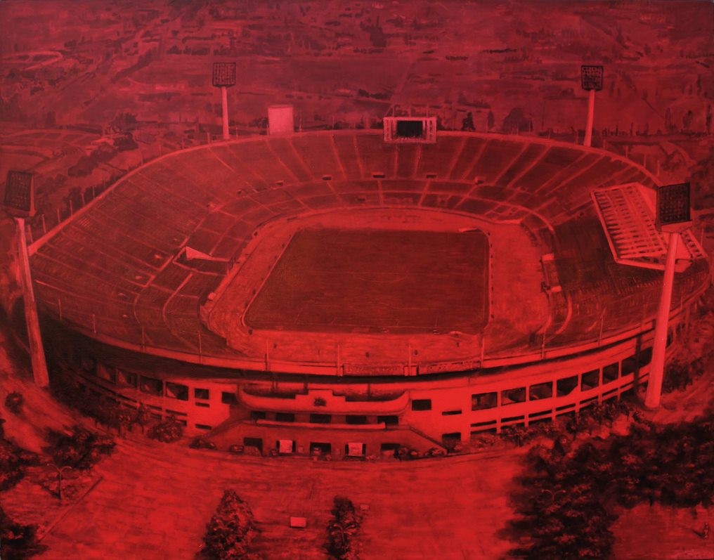 Campo de deportes II es la segunda obra en que Víctor Pávez aborda la figura del Estadio Nacional de Santiago de Chile. En clave monocroma y con un rojo saturado, alude a este recinto que es a la vez punto de encuentro de eventos deportivos y lugar de memoria, pues operó como centro de detención y tortura en 1973. El Estadio representa diferentes conceptos, como la contemplación, la memoria y el recogimiento. Esta obra ha sido presentada en dos instancias: primero, en la muestra “Arte/Naturaleza” en el Ekeby Qvam Art Space de Suecia (2002), y luego en la muestra colectiva “Rosa de los vientos” en el Centro de Artes Visuales de Santiago.