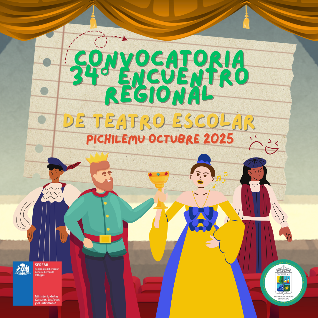 La Seremi de las Culturas de la región de O’Higgins mantiene abierta la convocatoria para el 34° Encuentro Regional de Teatro Escolar 2025, que se realizará en el mes de octubre, y que este año se enmarca en la conmemoración de los 80 años del Premio Nobel de Gabriela Mistral.