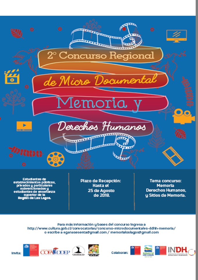La Secretaría Regional Ministerial de las Culturas, las Artes y el Patrimonio y Corporación Egaña 60, con la colaboración del Gobierno Regional, la Secretaría Regional Ministerial de Justicia, la Secretaría Regional Ministerial de Educación, la Dirección de Arquitectura del Ministerio de Obras Públicas y el Instituto Nacional de los Derechos Humanos, de la Región de Los Lagos; convocan a su 2° Concurso “MEMORIA Y DERECHOS HUMANOS”, en soporte microdocumental, que estimule la creación de los jóvenes, pudiendo constituirse así, en un factor de fortalecimiento para la memoria histórica del país y la valoración de los Derechos Humanos.