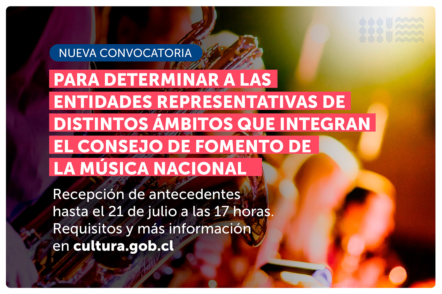 El Consejo de Fomento de la Música Nacional, establecido en la Ley N°19.928 sobre Fomento de la Música Chilena, de la Subsecretaría de las Culturas y las Artes, del Ministerio de las Culturas, las Artes y el Patrimonio, informa que corresponde renovar a cinco de sus consejeros integrantes, los cuales, de acuerdo a lo dispuesto en el artículo 4º de la ley en comento, corresponden a las siguientes personas: