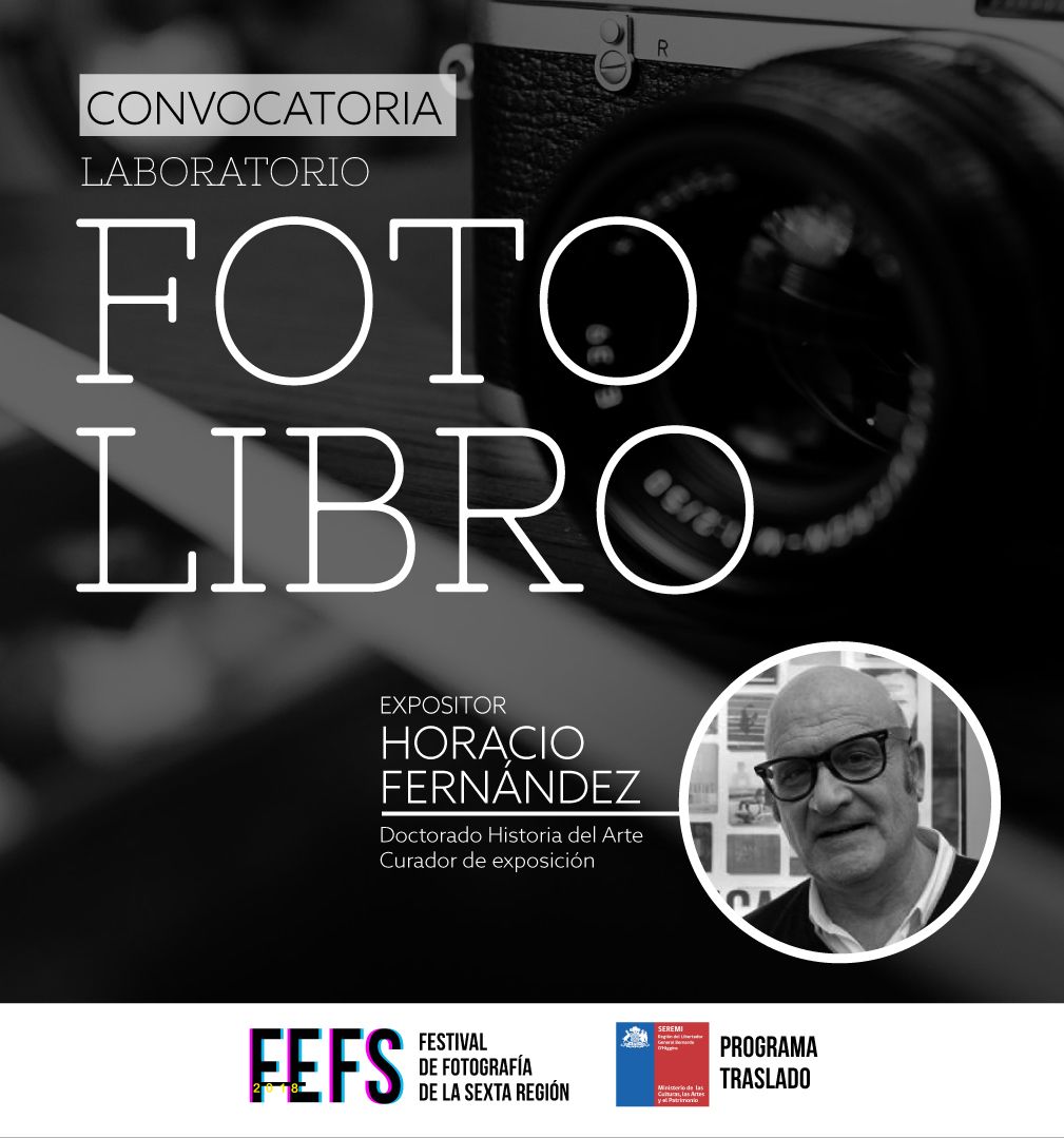 El Ministerio de las Culturas, las Artes y el Patrimonio, a través de la Seremía de Cultura de la Región del Libertador General Bernardo O’Higgins y la macroárea de Artes de la Visualidad, y el Festival de Fotografía de la Sexta Región-FEFS 2018 convocan a artistas contemporáneos de artes visuales, fotografía y nuevos medios de las regiones de O’Higgins, Maule y Valparaíso para participar en un Laboratorio de Fotolibros con el destacado historiador español Horacio Fernández, que se realizará entre el 25 y 26 de agosto de 2018, en la ciudad de Rancagua.