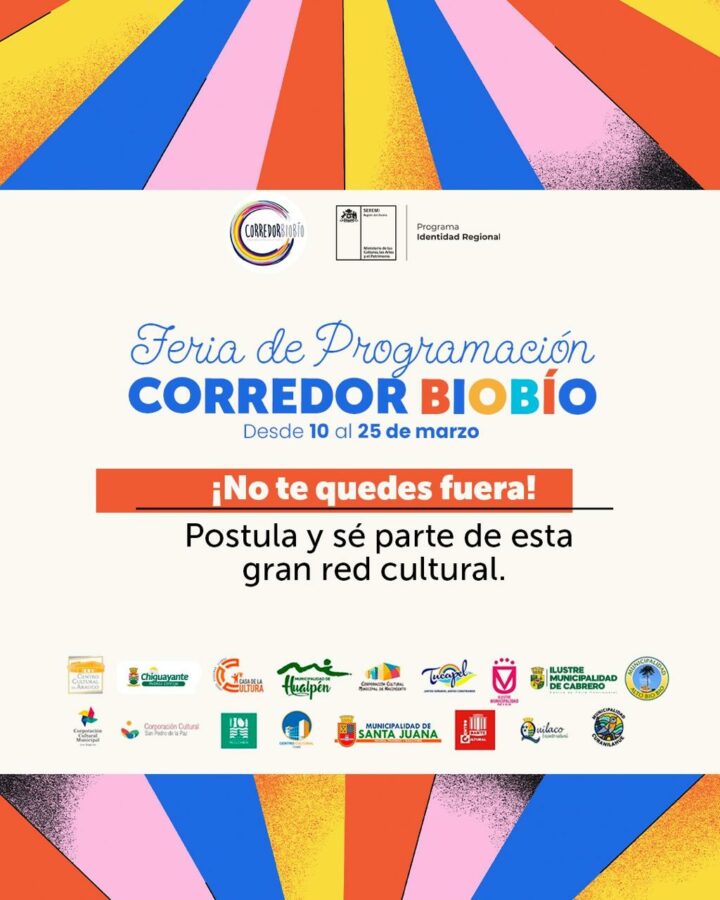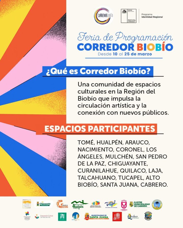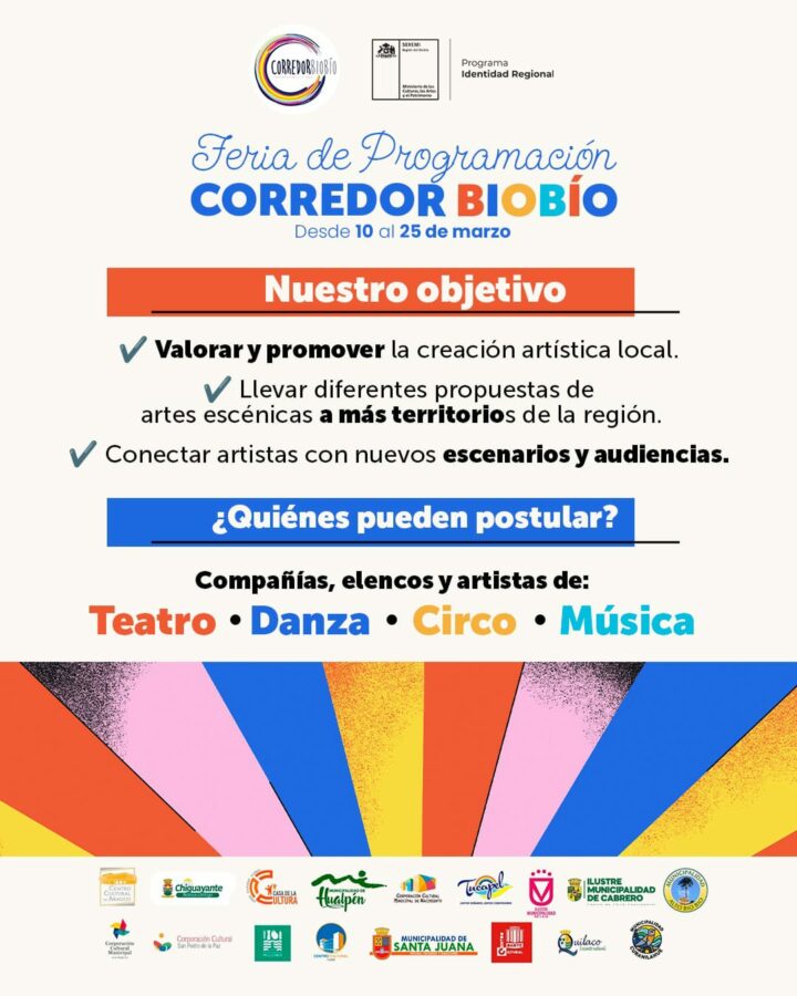 La comunidad de espacios culturales de CorredorBiobío y la Seremi de las Culturas, las Artes y el Patrimonio del Biobío invitan a compañías, elencos y artistas a postular sus espectáculos para ser parte de la programación 2025. La convocatoria está dirigida a creadores de teatro, danza, circo, narración oral y música en diversos géneros, quienes podrán itinerar por los 17 espacios culturales que conforman la red.