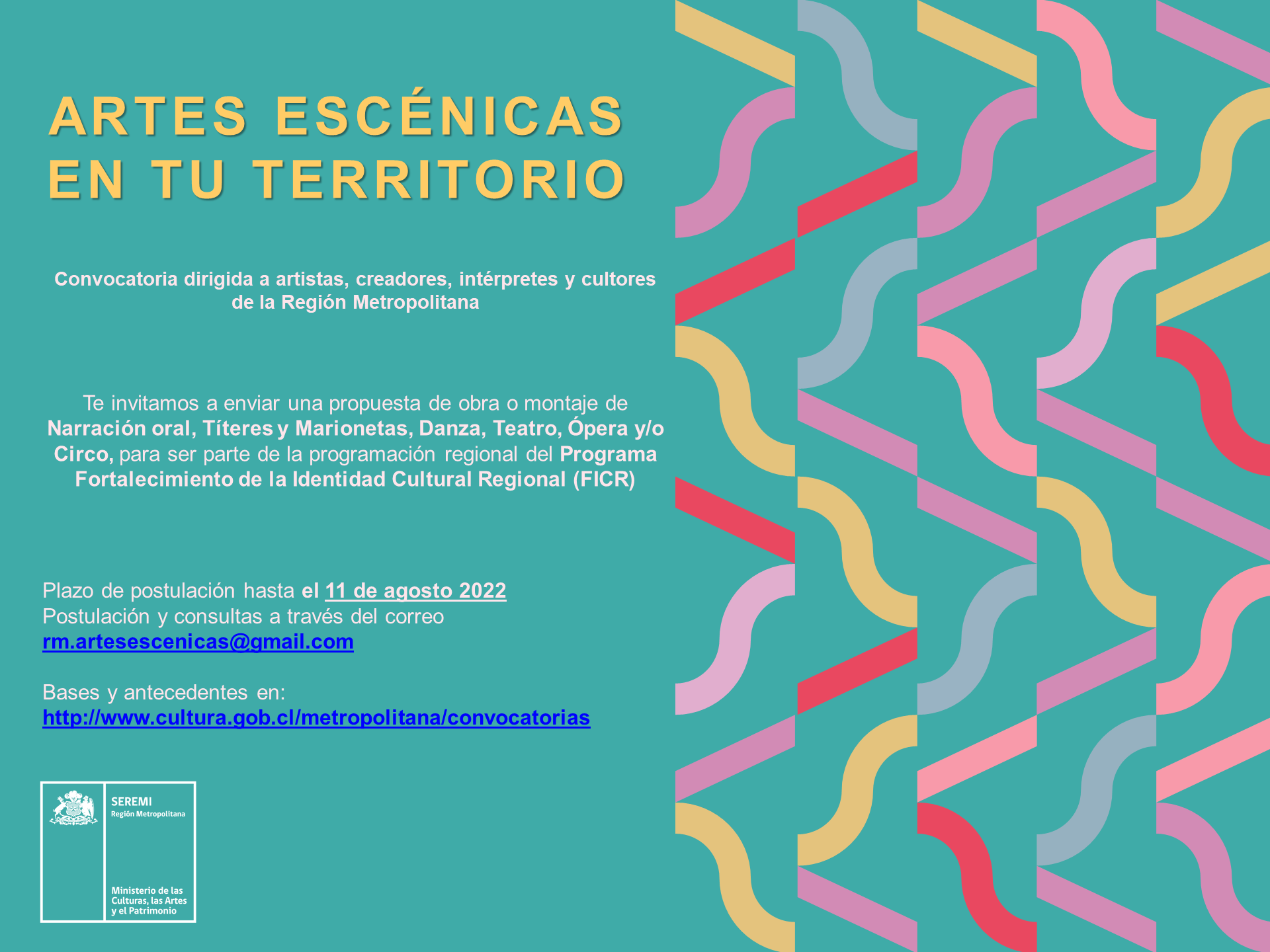 Con el propósito de contribuir al reconocimiento y valoración social de las Artes Escénicas en su conjunto y de sus exponentes regionales, la Secretaría Regional Ministerial de las Culturas, las Artes y el Patrimonio, Región Metropolitana a través de su Programa Fortalecimiento de la Identidad Cultural y la Unidad Regional de Fomento lanzan la convocatoria “Artes Escénicas en tu Territorio”.
