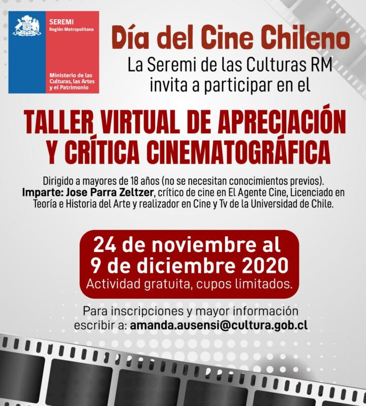De forma paralela, la Seremi de las Culturas RM invita a participar en el Taller de apreciación y crítica cinematográfica que tendrá lugar de forma online entre los días 24 de noviembre y 9 de diciembre. Se trata de una actividad gratuita, que a través de una metodología expositiva y didáctica busca acercar contenidos básicos de apreciación, lectura y crítica cinematográfica, con el fin de aportar un léxico elemental a los participantes, poco familiarizados con conceptos fundamentales de la historia del cine y de la realización y el análisis fílmico.