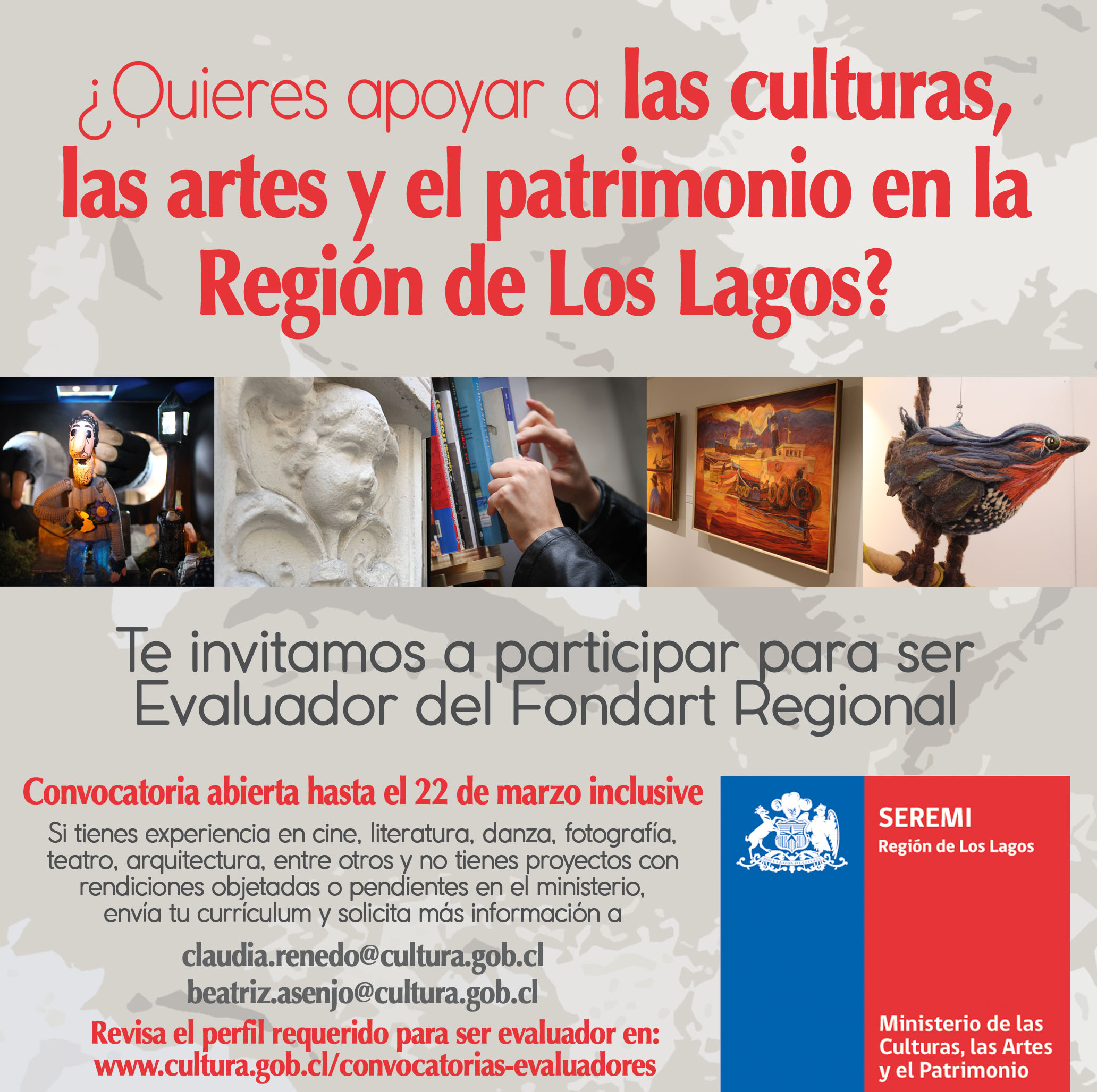 Te invitamos a participar y a animarte para que nos apoyes en este importante proceso de selección. El cierre de esta convocatoria es el 22 de marzo y nuestros departamentos de Fomento de las Artes, Fondos Concursable y OIRS, estarán atento a tus dudas y postulación en los correos: claudia.renedo@cultura.gob.cl y a beatriz.asenjo@cultura.gob.cl.