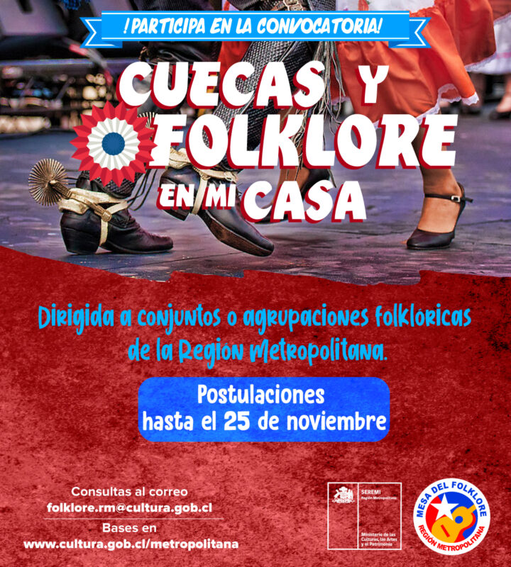 Para participar de la convocatoria “Cuecas y Folklore en mi Casa” los postulantes deben ser personas naturales o jurídicas, chilenas o extranjeras, con residencia en la Región Metropolitana, que dediquen su quehacer al desarrollo artístico del folklore, a través de la música, el canto y la danza.
