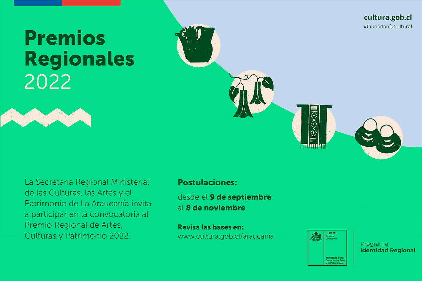 La Seremi de las Culturas, las Artes y el Patrimonio de La Araucanía convoca a la presentación de candidaturas de personas artistas, gestoras y cultoras a fin de ser reconocidas individualmente con el “Premio Regional de Artes, Culturas y Patrimonio” dirigida a la Trayectoria Artística de la Región de La Araucanía, en sus cinco modalidades: