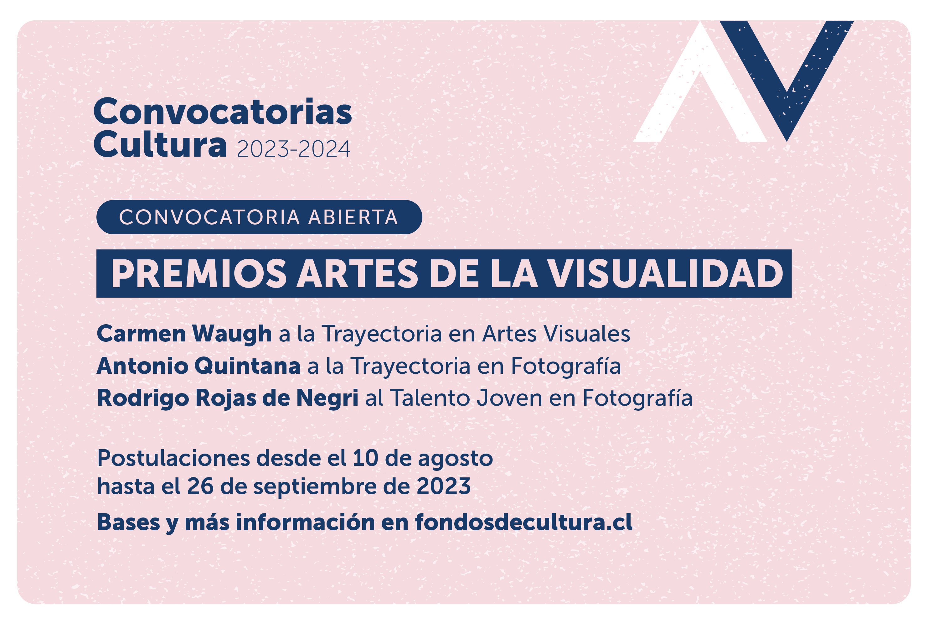 El Ministerio de las Culturas, las Artes y el Patrimonio abrió la convocatoria para postular al Premio Artes de la Visualidad 2023, donde se entregarán tres reconocimientos: Premio “Carmen Waugh a la trayectoria en artes visuales”; Premio “Antonio Quintana a la trayectoria en fotografía” y Premio “Rodrigo Rojas de Negri al talento joven en fotografía”.
