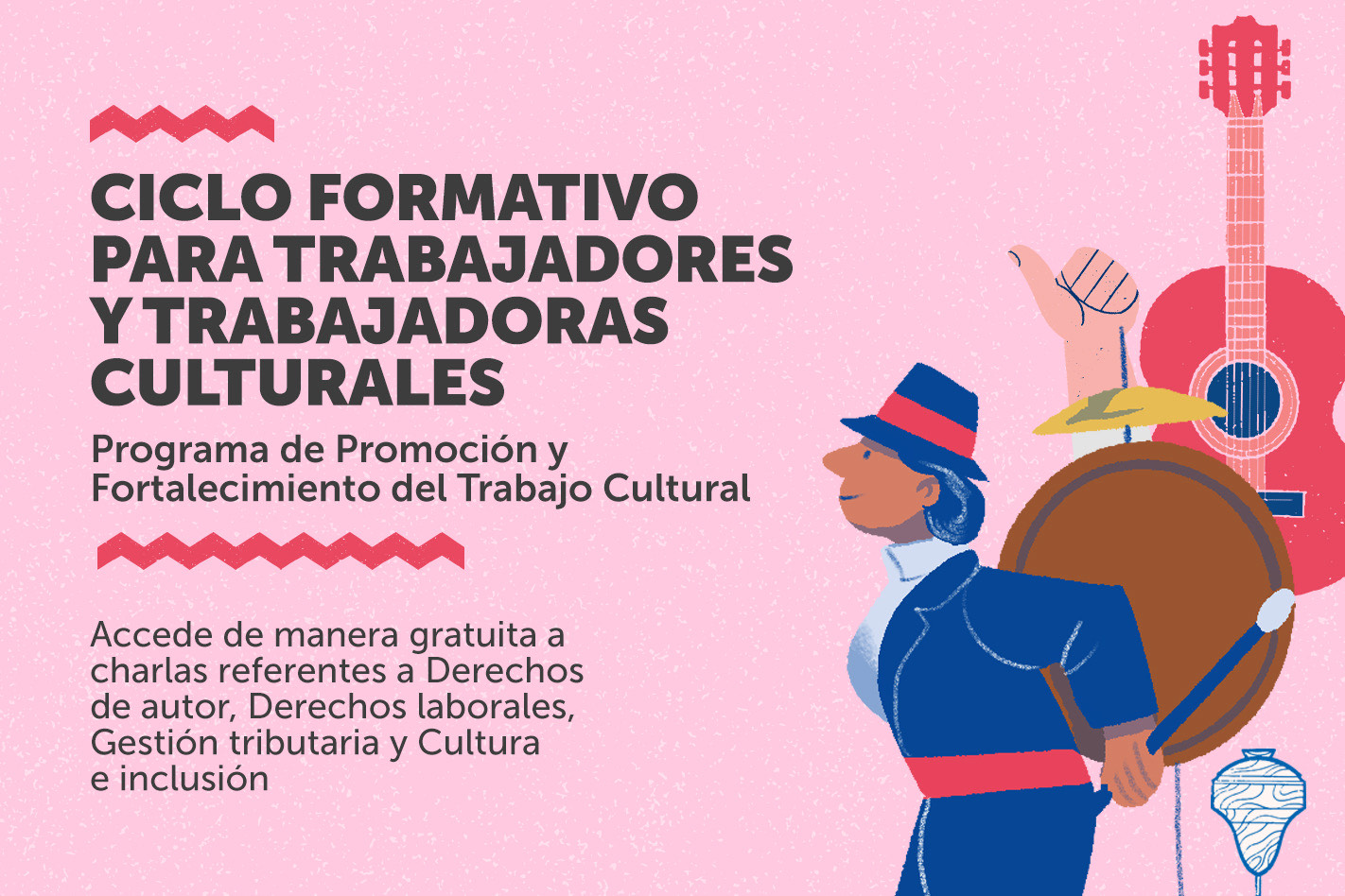 En este sentido, ponemos a disposición un ciclo formativo que aborda cuatro grandes ejes: Derechos de autor, Derechos laborales, Gestión tributaria y Cultura e inclusión. Este ciclo está dirigido especialmente para aquellos trabajadores y trabajadoras culturales de todo el país, que requieran formación en estas materias, fortaleciendo no solo sus conocimientos, sino también robusteciendo el trabajo de las organizaciones en las que desarrollan su labor.
