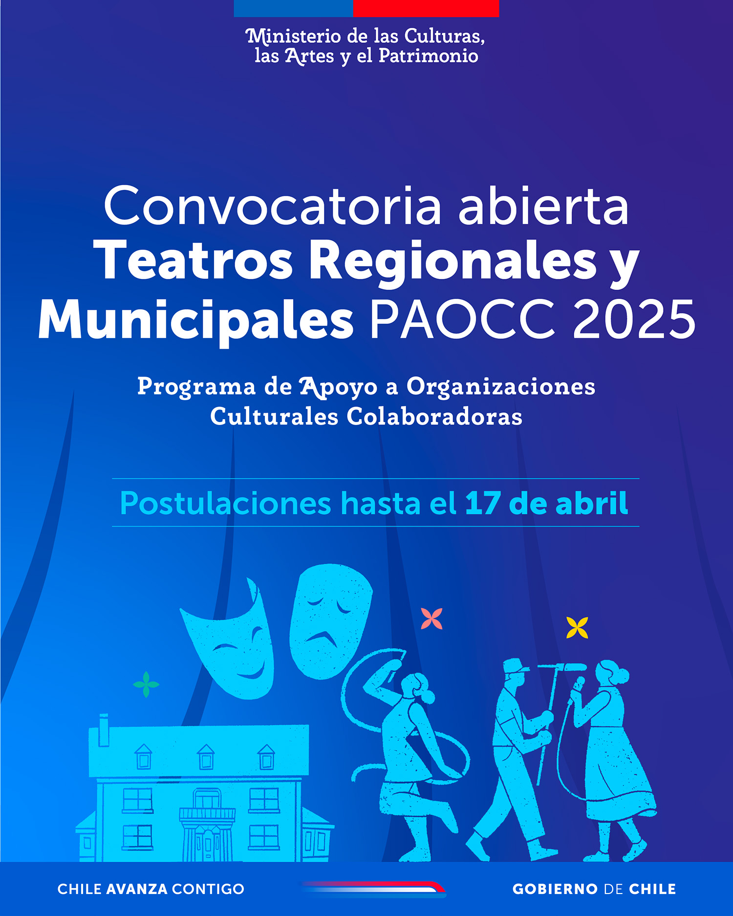 Desde el 27 de marzo y hasta el jueves 17 de abril a las 17:00 horas se encontrará abierta la convocatoria para Teatros Regionales y Municipales, del Programa de Apoyo a Organizaciones Culturales Colaboradoras (PAOCC). Esta convocatoria tiene por objetivo invitar a las organizaciones culturales que administran estos espacios, con el fin de financiar la totalidad o una parte de sus planes de gestión y/o la programación.