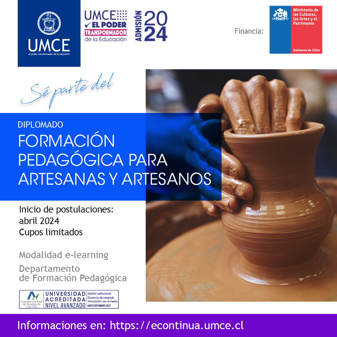 El Ministerio de las Culturas, las Artes y el Patrimonio junto a la Universidad Metropolitana de Ciencias de la Educación (UMCE) con la colaboración de la Unión Nacional de Artesanos (UNAR) comenzó el proceso de postulación para cursar el Diplomado de Formación Pedagógica para artesanas y artesanos 2024, programa que busca fortalecer el ámbito formativo y ampliar las posibilidades de traspaso de los oficios en espacios educativos.
