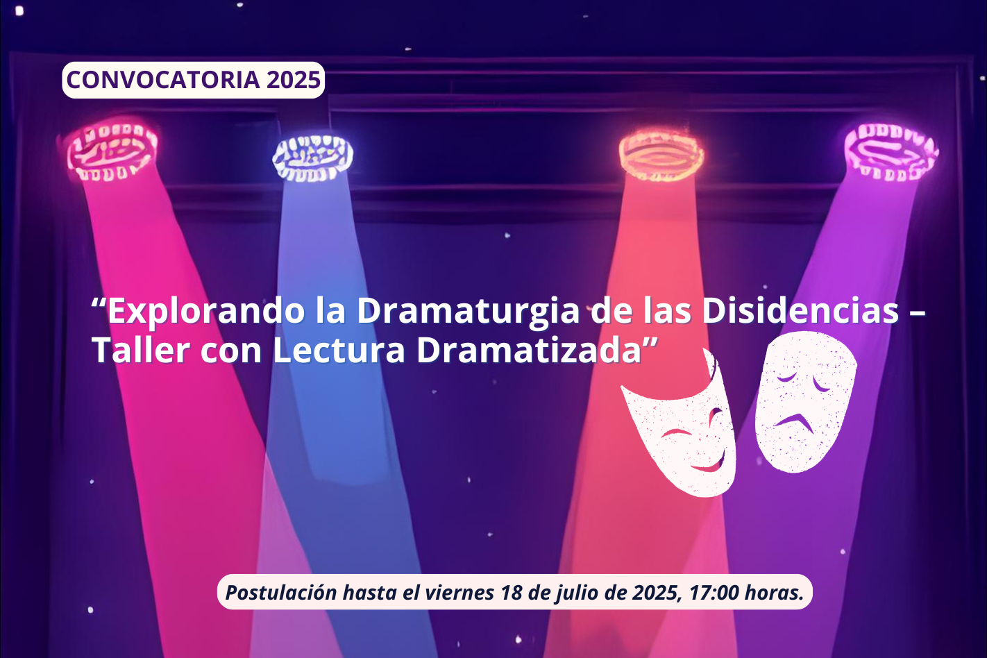 La Secretaría Regional Ministerial de las Culturas, las Artes y el Patrimonio de la Región Metropolitana invita a personas interesadas en la escritura teatral a postular al Programa Formativo “Explorando la Dramaturgia de las Disidencias – Taller con Lectura Dramatizada”, instancia gratuita orientada a la creación, reflexión y aprendizaje en torno a las experiencias de las disidencias sexuales y de género, desde una perspectiva artística, política y cultural contemporánea.