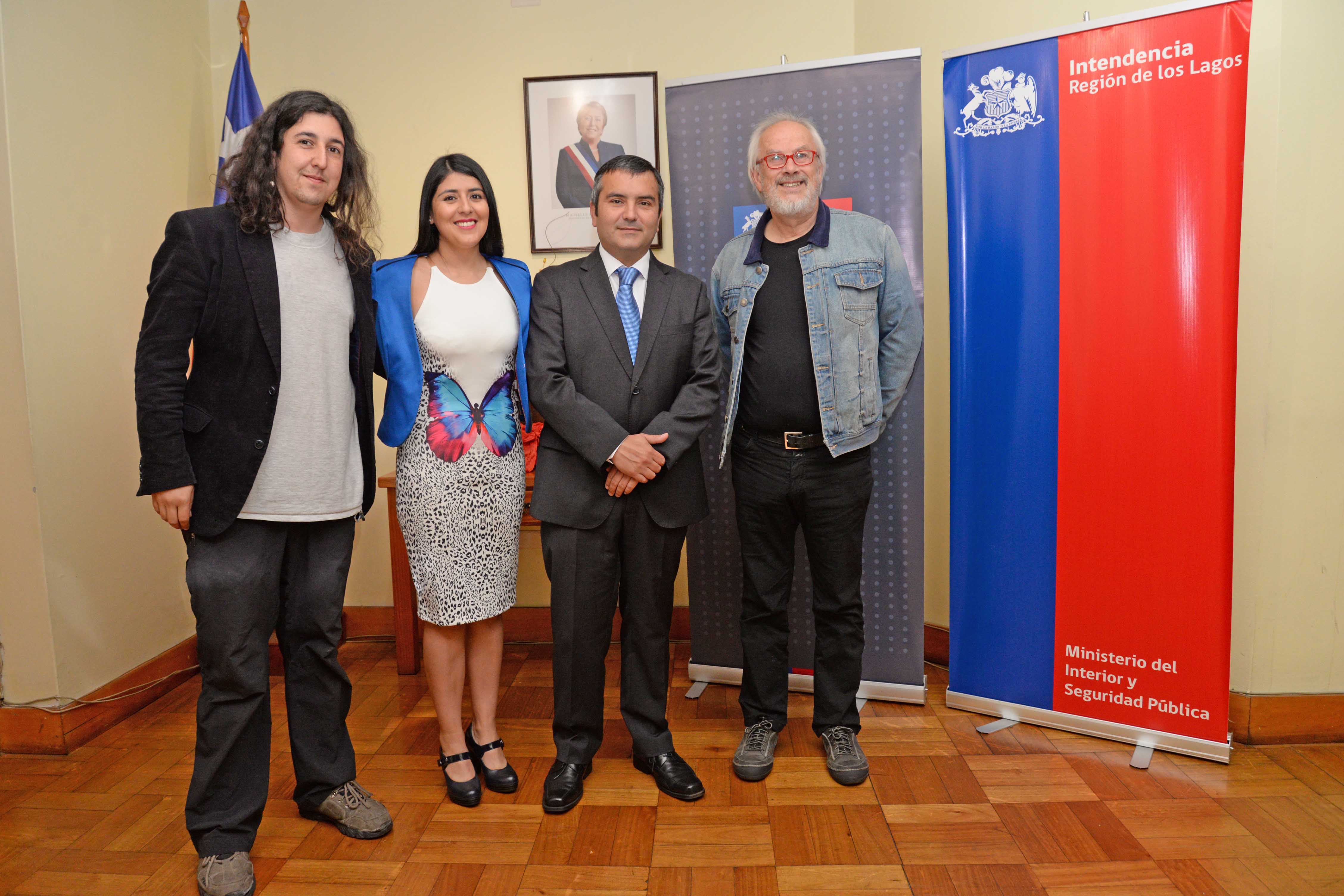 Foto: Benjamín Brunet, ganador Premio Joven 2016; Evelyn Almonacid, directora regional del Consejo de la Cultura; Leonardo de la Prida, Intendente Regional; y Rubén Schneider, Premio Regional Trayectoria 2016.