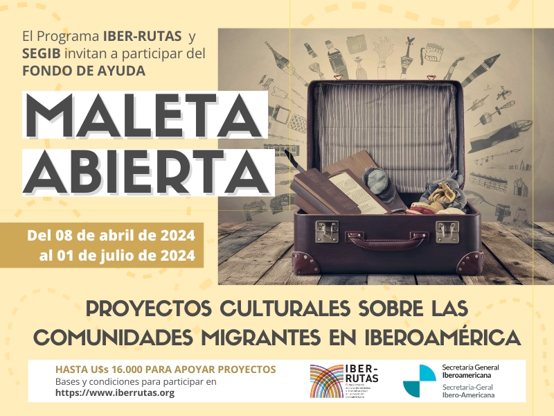 Con el objetivo de fomentar el intercambio de experiencias, fortalecer la cooperación y promover el reconocimiento y respeto por la diversidad cultural en la región, el Programa IBER-RUTAS, en colaboración con la Secretaría General Iberoamericana (SEGIB), invita a participar en el Concurso Internacional Fondo de Ayuda Maleta Abierta 2024 “Proyectos culturales sobre las comunidades migrantes en Iberoamérica”.