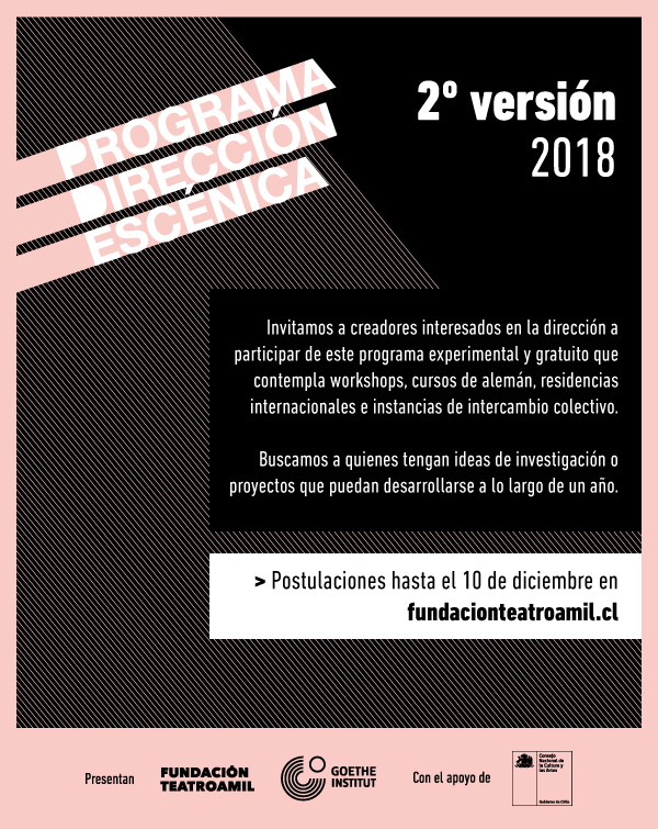 Recordemos que, el Programa de Dirección Escénica es presentado por Fundación Teatro a Mil y Goethe-Institut Chile, con el apoyo del Consejo Nacional de la Cultura y las Artes. La iniciativa fue impulsada por primera vez en 2016 además contó con la colaboración de las Escuelas de Teatro de la Universidad Católica, Universidad Finis Terrae y Universidad de Chile.