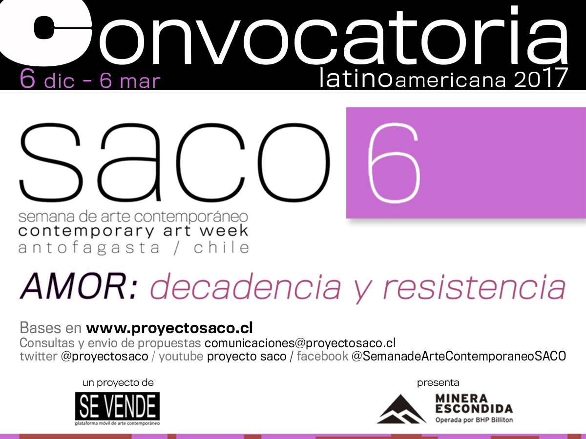 SACO6, que cuenta con el patrocinio del Consejo de la Cultura de Antofagasta, invita a artistas latinoamericanos a participar en la convocatoria para la exposición principal denominada AMOR: decadencia y resistencia. Los creadores seleccionados, junto con todos los gastos pagados, contarán con una semana de residencia en ISLA, Instituto Superior Latinoamericano de Arte, para la materialización y montaje de sus obras y con un honorario. Posteriormente a la inauguración, participarán en el viaje de contextualización con el territorio, a Quillagua, lugar reconocido por NASA como el más árido del planeta.
