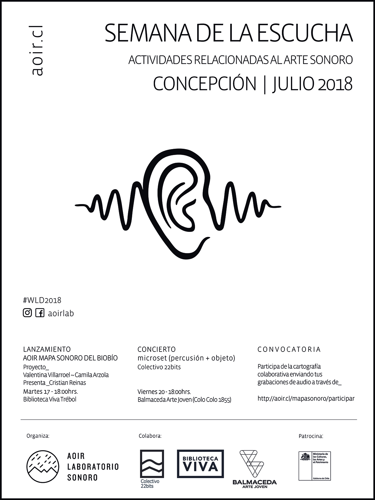 Con el objetivo de promover en la región las prácticas relacionadas a las artes sonoras e incentivar el interés por el sonido y su importancia cultural nace por primera vez, a cargo de AOIR Laboratorio Sonoro, la celebración de la Semana de la Escucha en Concepción, que se realiza mundialmente desde el año 2010.