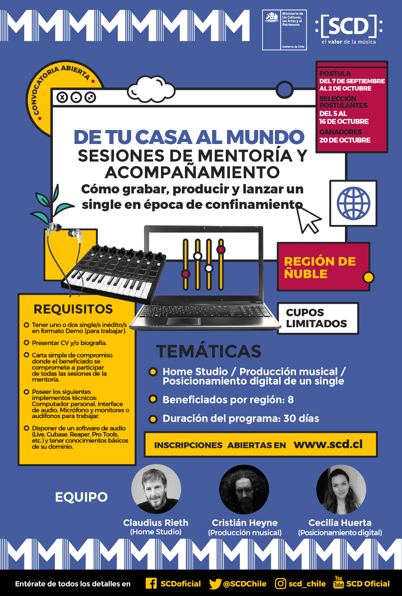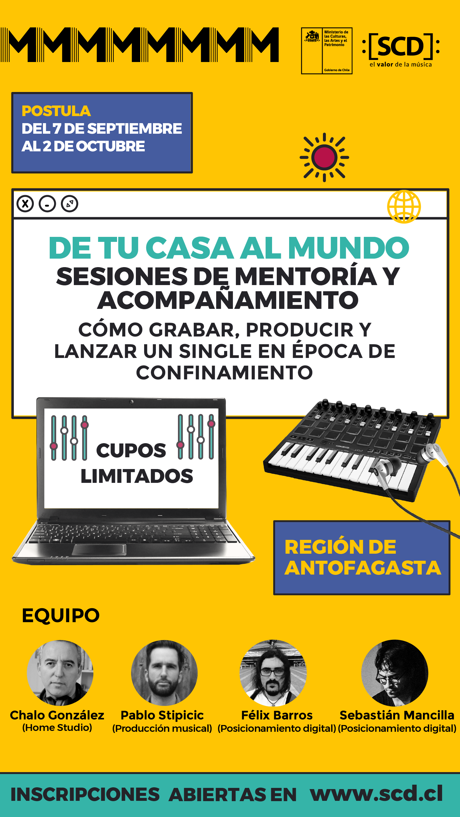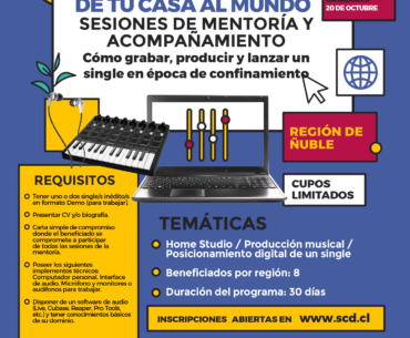 En momentos en que el sector de la música se vuelca al mundo digital para compartir su arte y trabajo, el Ministerio de las Culturas, las Artes y el Patrimonio junto a la Sociedad Chilena de Autores e Intérpretes (SCD), ofrecerá una capacitación para que músicos y músicas de distintas regiones del país puedan trabajar en la publicación de un sencillo o single, desde la etapa más temprana de la composición hasta su puesta en circulación a través de plataformas digitales. Todo, sin moverse de su casa.