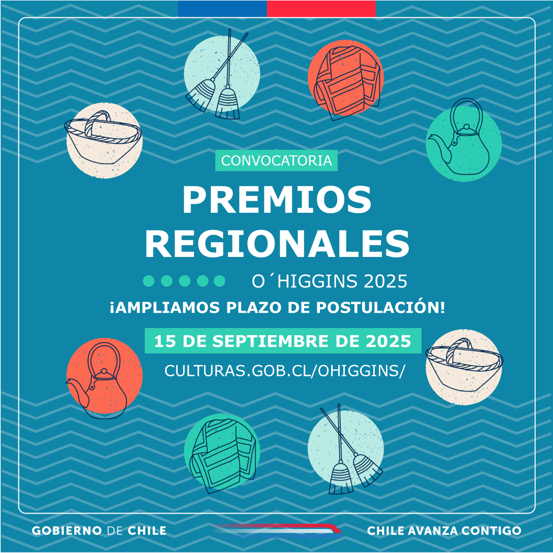 Hasta el lunes 15 de septiembre se amplió el plazo para que artistas y cultores/as puedan postular a los Premios Regionales de las Culturas, las Artes y el Patrimonio 2025. Los reconocimientos tiene por objetivo reconocer el trabajo creativo y la trayectoria de artistas, gestores y cultores de la región de O’Higgins.