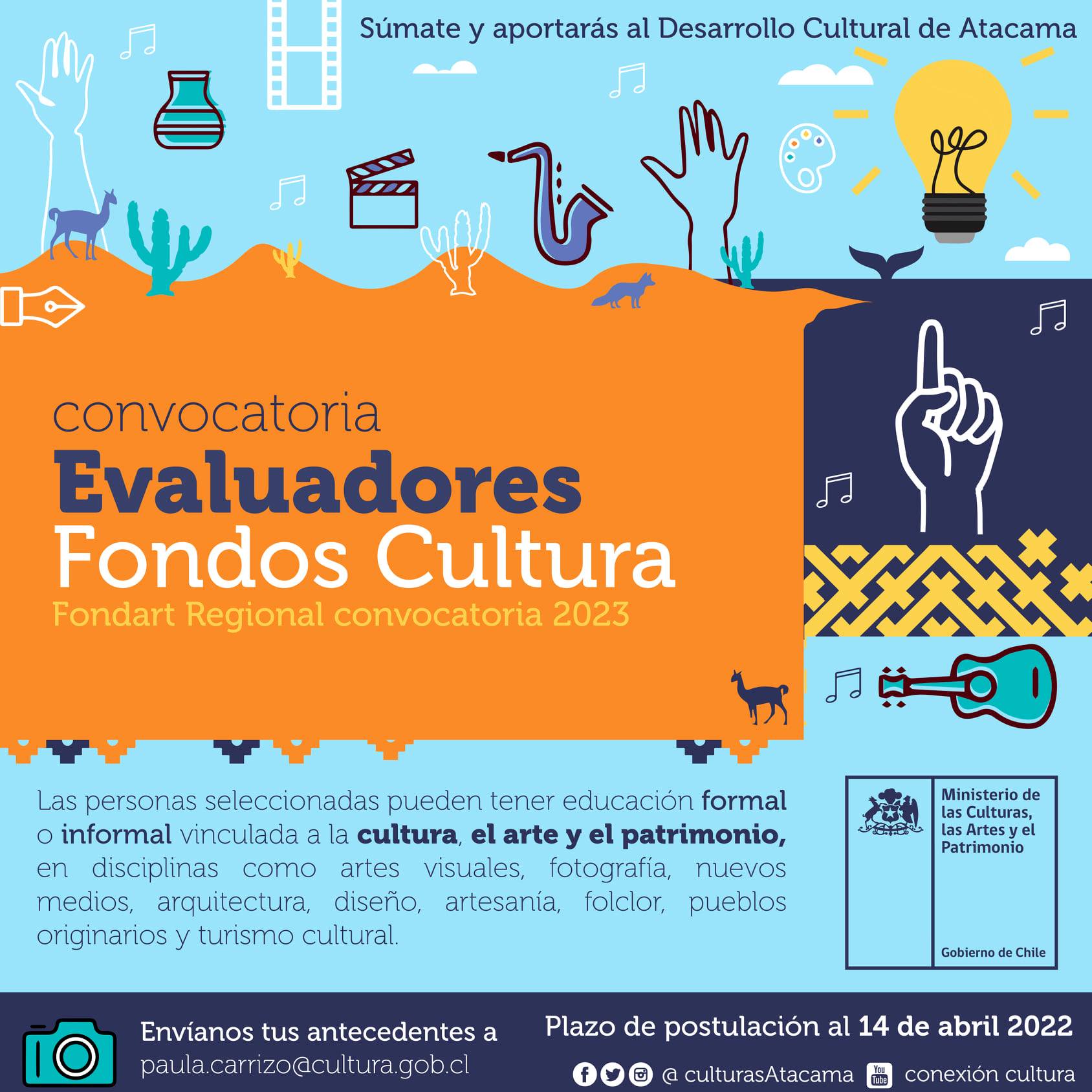 La Secretaría Regional Ministerial de las Culturas, las Artes y el Patrimonio de Atacama, abrió el proceso de postulación para ser parte del Comité de Evaluadores para el concurso Fondart Regional 2023, llamado que culmina el jueves 14 de abril del presente año.