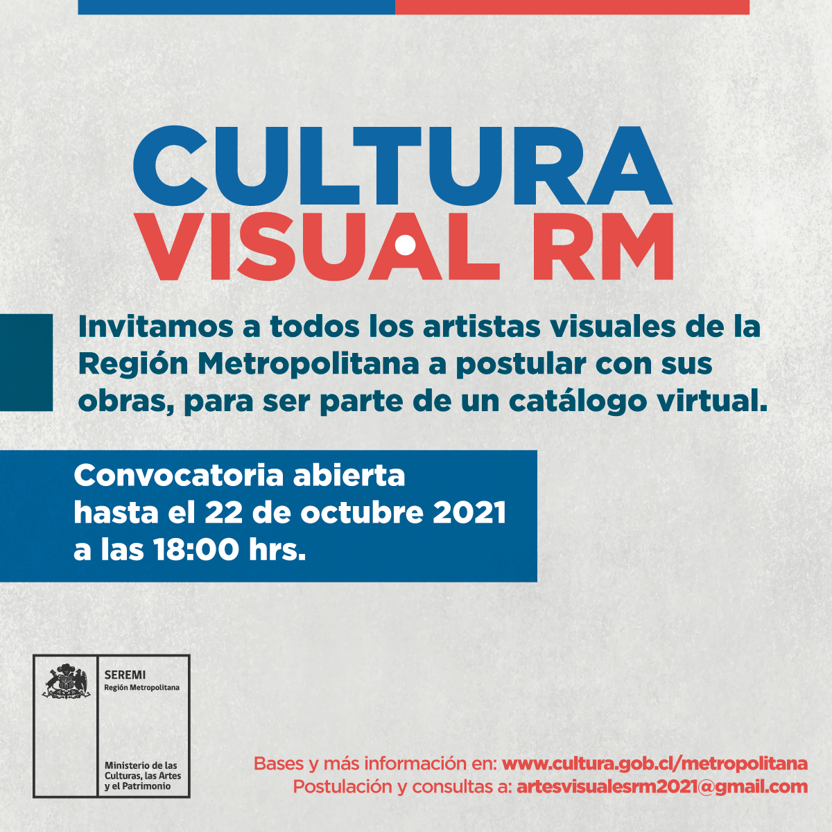 La Seremi de las Culturas, las Artes y el Patrimonio de la Región Metropolitana, a través de su Unidad Regional de Fomento, en conjunto con el Programa de Desarrollo y Fomento de las Artes de la Visualidad, extiende la invitación a participar en la convocatoria “Cultura Visual RM” dirigida a los y las artistas visuales de la Región Metropolitana.