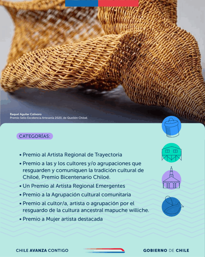 Las postulaciones estarán abiertas desde el 8 de agosto hasta el 12 de septiembre de 2025, y deberán entregarse presencialmente en la SEREMI de las Culturas, Puerto Montt. Los premios incluyen montos que van desde $1.500.000 a $2.000.000 millones de pesos más una estatuilla, creada por la artista, Raquel Aguilar Colivoro, Sello de Excelencia a la Artesanía 2020.