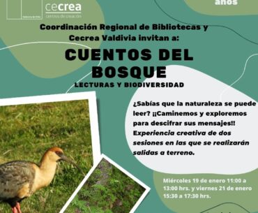 Cuentos del bosque es la última de las cuatro alternativas para participantes de 7 a 12 años. En alianza con la Coordinación Regional de Bibliotecas Públicas, el llamado es a leer la naturaleza, recorriéndola y descifrando sus mensajes. La actividad se realizará en dos sesiones los días miércoles 19 de 11 a 13 horas y el viernes 21 de 15.30 a 17.30 horas, ambas con salidas a terreno.