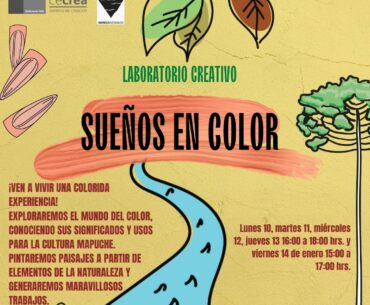 Para el mismo público, el laboratorio creativo Sueños en color, realizado en alianza con la Pontificia Universidad Católica de Chile, invita a adquirir el maravilloso y ancestral conocimiento sobre el significado de los colores dentro de la cosmovisión mapuche y a partir de ellos experimentar con diferentes pigmentos. Además, en la segunda sesión, dos integrantes de la Mesa de Mujeres Mapuches compartirán sus saberes con los participantes. Sesiones el lunes 10, martes 11, miércoles 12 y jueves 13 de enero, de 16 a 18 horas, y el viernes 14 de 15 a 17 horas.