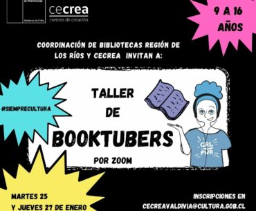Como única actividad en modalidad virtual, el Taller de Booktubers que realizará Diego Valdés de la Biblioteca Pública Digital y en alianza con la Coordinación Regional de Bibliotecas, llevará a los participantes a conocer diferentes herramientas para generar videos con reseñas de libros que les gusten, crear sus propios registros y luego difundirlos. Para niñas, niños y jóvenes de 9 a 16 años, el martes 25 y el jueves 27 de enero, de 11.30 a 12.30 horas.
