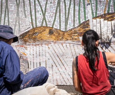 Con todos los materiales producidos en los talleres —dibujos, notas, fotografías y registros de especies— la Colectiva elaboró dos bosquejos que guiaron la creación final: un mural de mosaico en vidrio de 20 m² armado en el taller de los muralistas y luego instalado por partes en la pared de una escalera de la costanera.
