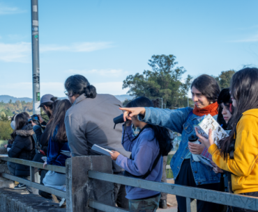 Para crear colectivamente el imaginario del mural fueron necesarias varias instancias. El ciclo comenzó con un taller de observación en terreno impartido por la Colectiva Ko Habitantes en mayo. Allí, los estudiantes recibieron herramientas para realizar un monitoreo comunitario del humedal urbano. Primero tuvieron una sesión en sala y luego, con sus libretas en mano, registraron especies y comportamientos en un recorrido por la costanera, desde las letras Villarrica hasta el embarcadero. Los estudiantes fueron acompañados por Daniel Salvo, profesor de Ciencias del Colegio Altas Cumbres.