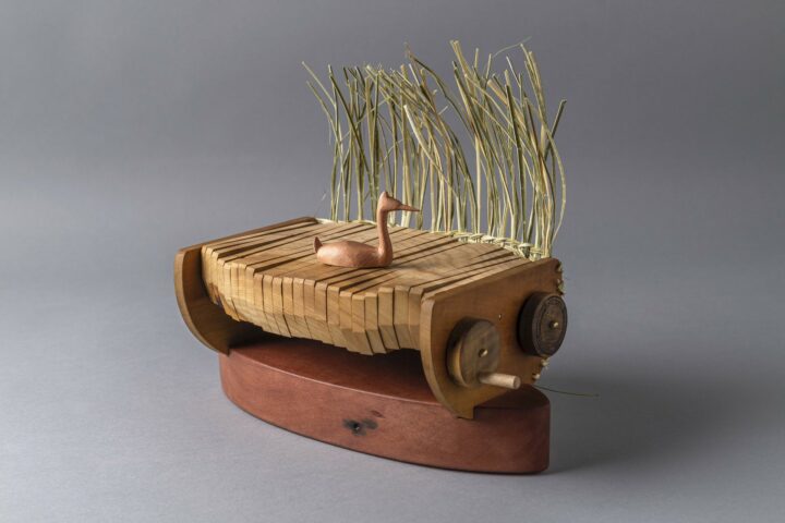 La obra “Huala”, con la que fue preseleccionado, fue realizada en coautoría y co-diseño con Jessica Vidal. Construida en base a madera y fibras naturales, a través de un mecanismo autómata recrea el movimiento sobre el agua de esta ave que habita ríos y lagos y que anida en los humedales. “Es una obra que se inspira en los humedales y en las aves presentes en la cuenca del lago Ranco”, precisa, agregando que con ella “busca generar una sensibilidad de las personas por estos espacios muy vulnerables y que tienen que ser protegidos”.