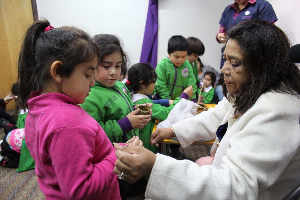 La Semana de la Educación Artística también generó instancias de encuentro entre estudiantes e integrantes de pueblos originarios. Carolina Quintul, artesana Kawésqar, mostró y enseñó su trabajo a niñas y niños de la Escuela Especial de Lenguaje Santa Laura de Punta Arenas.